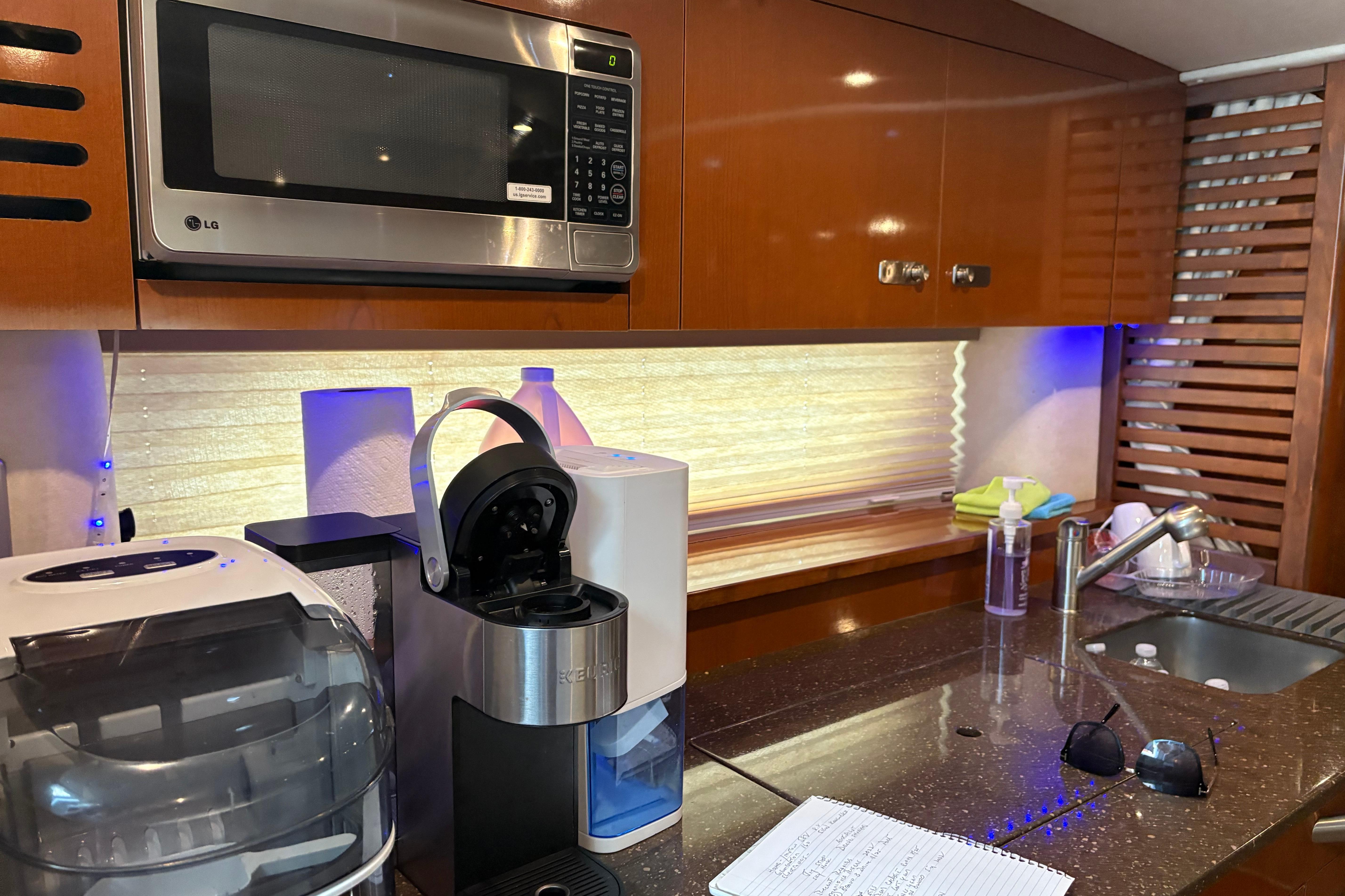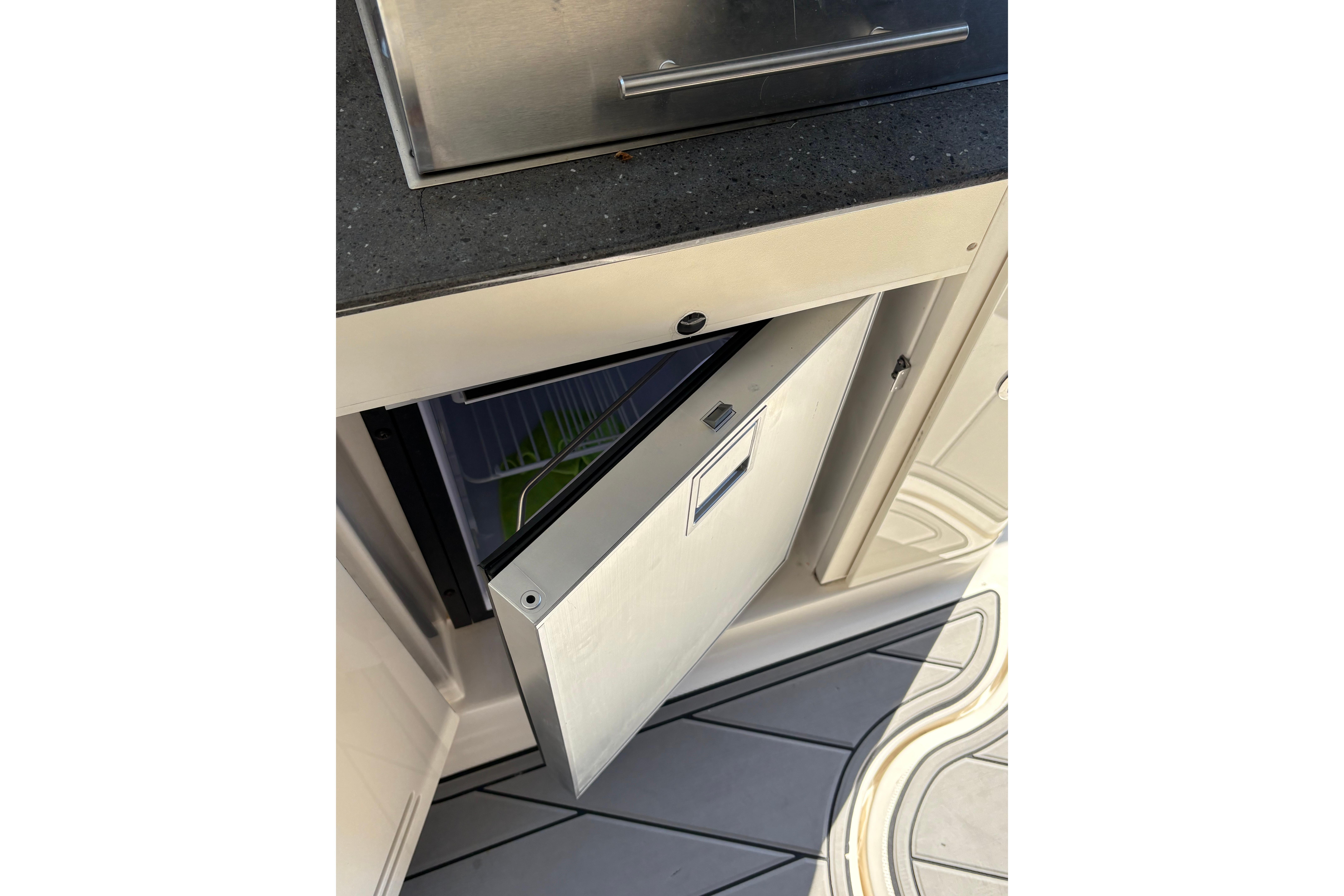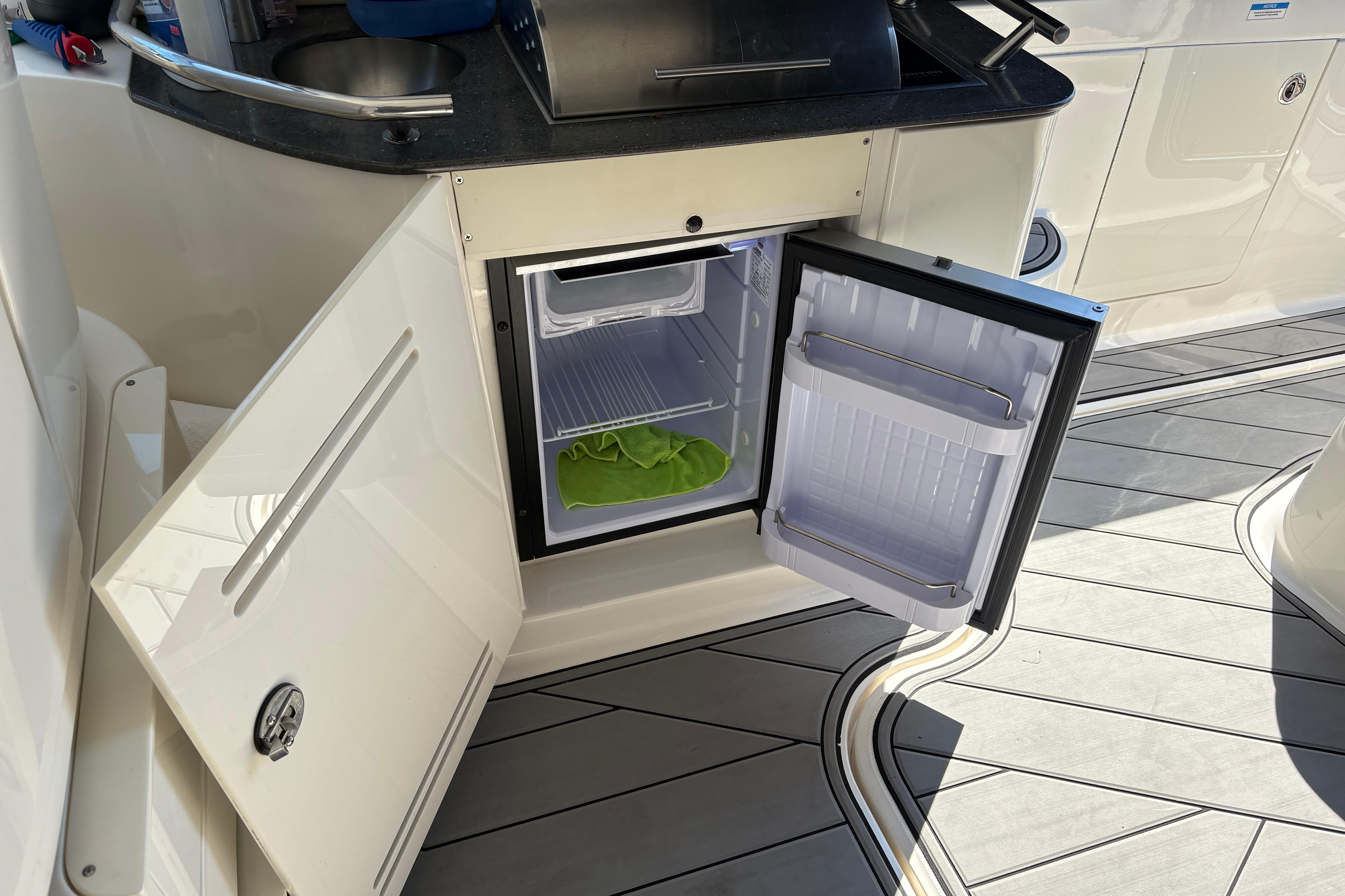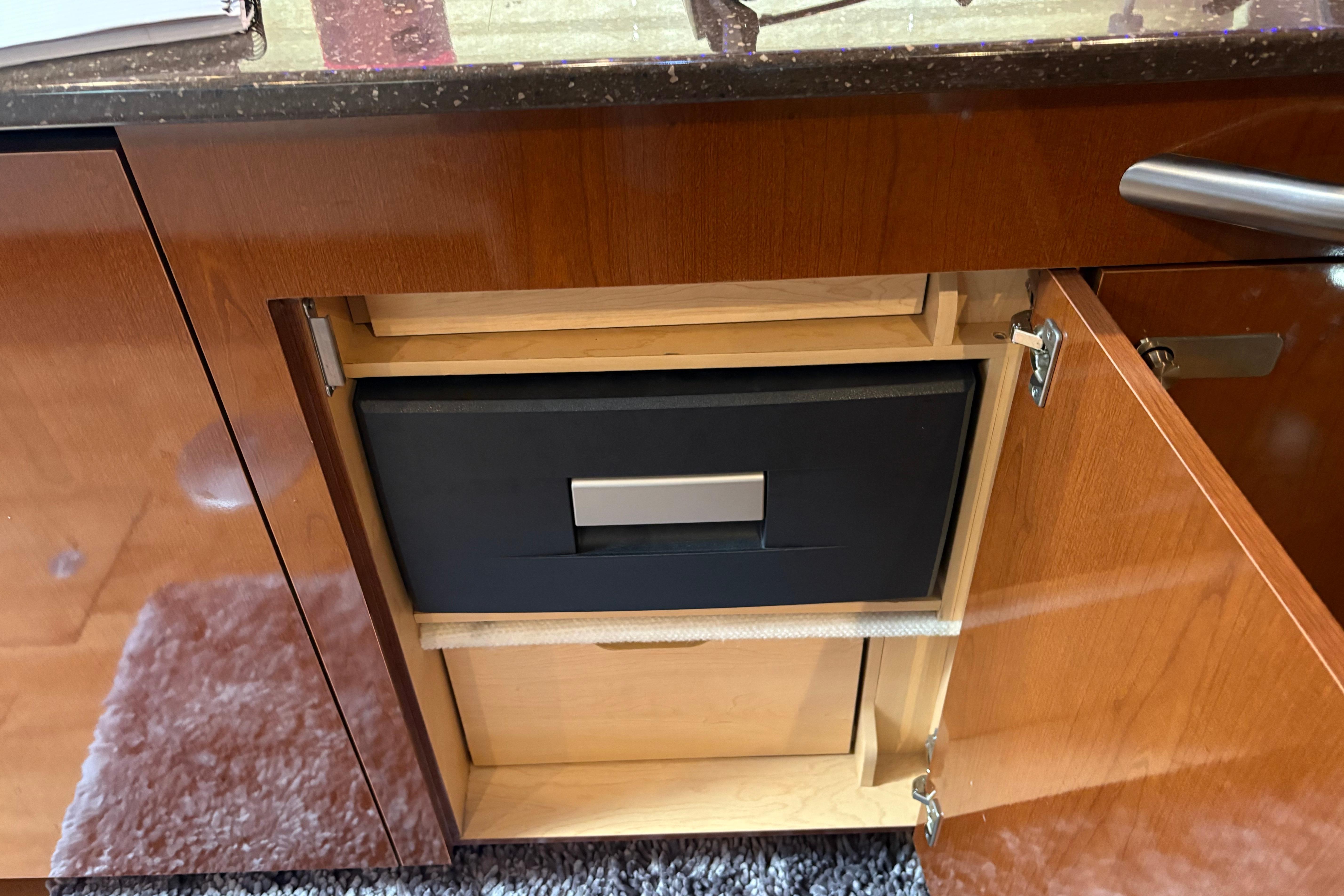 - Cockpit wet bar with solid-surface countertop and refrigerator.
