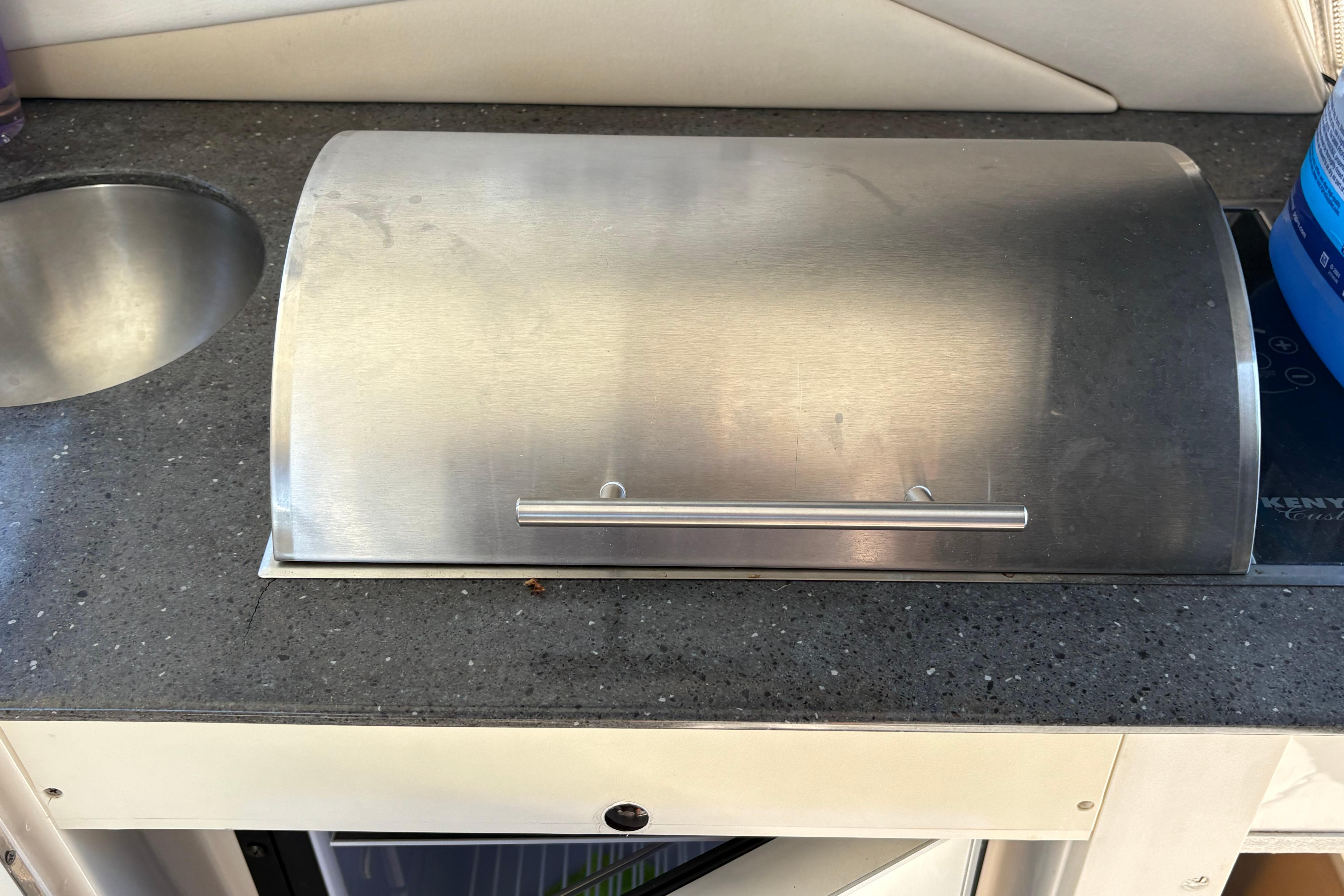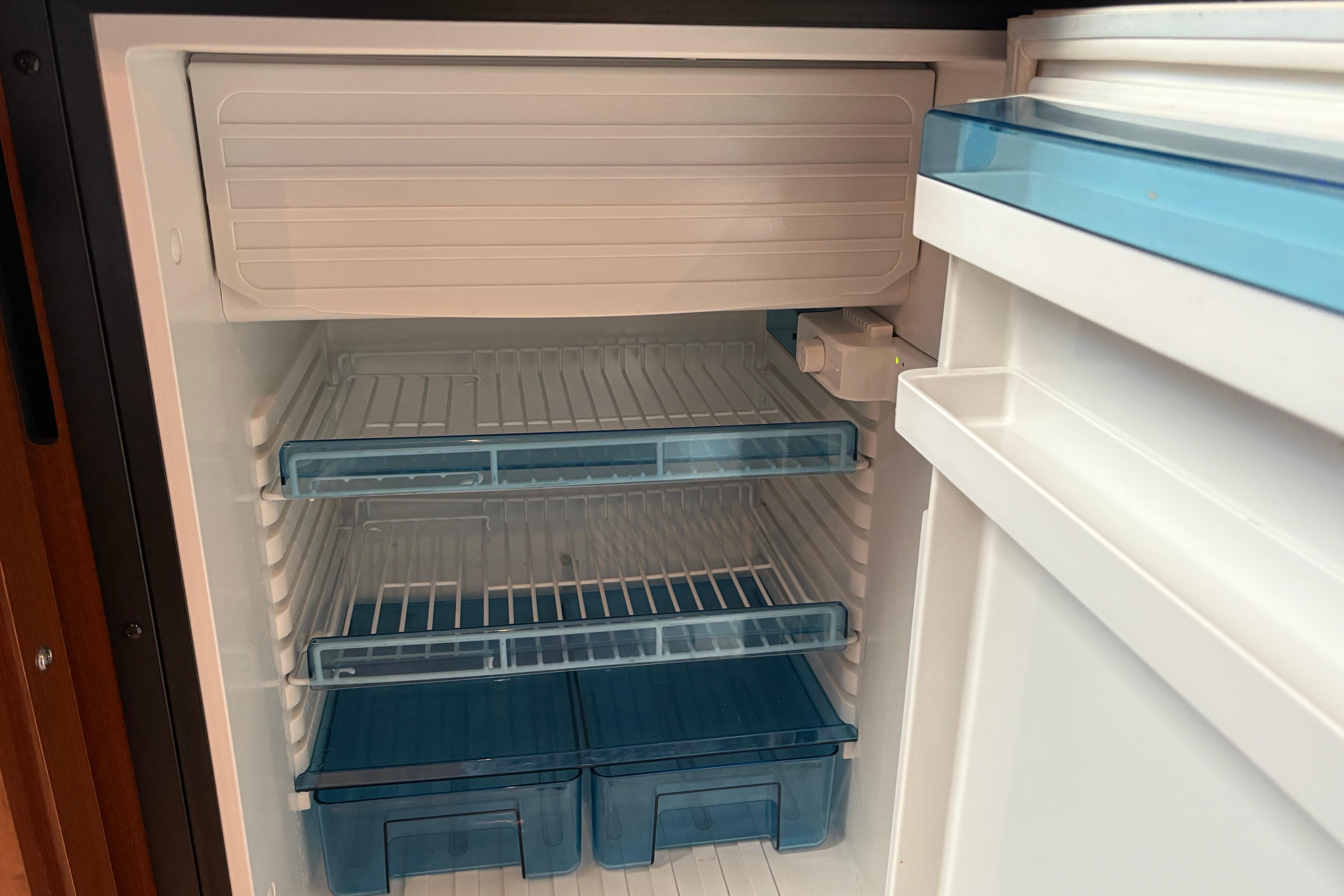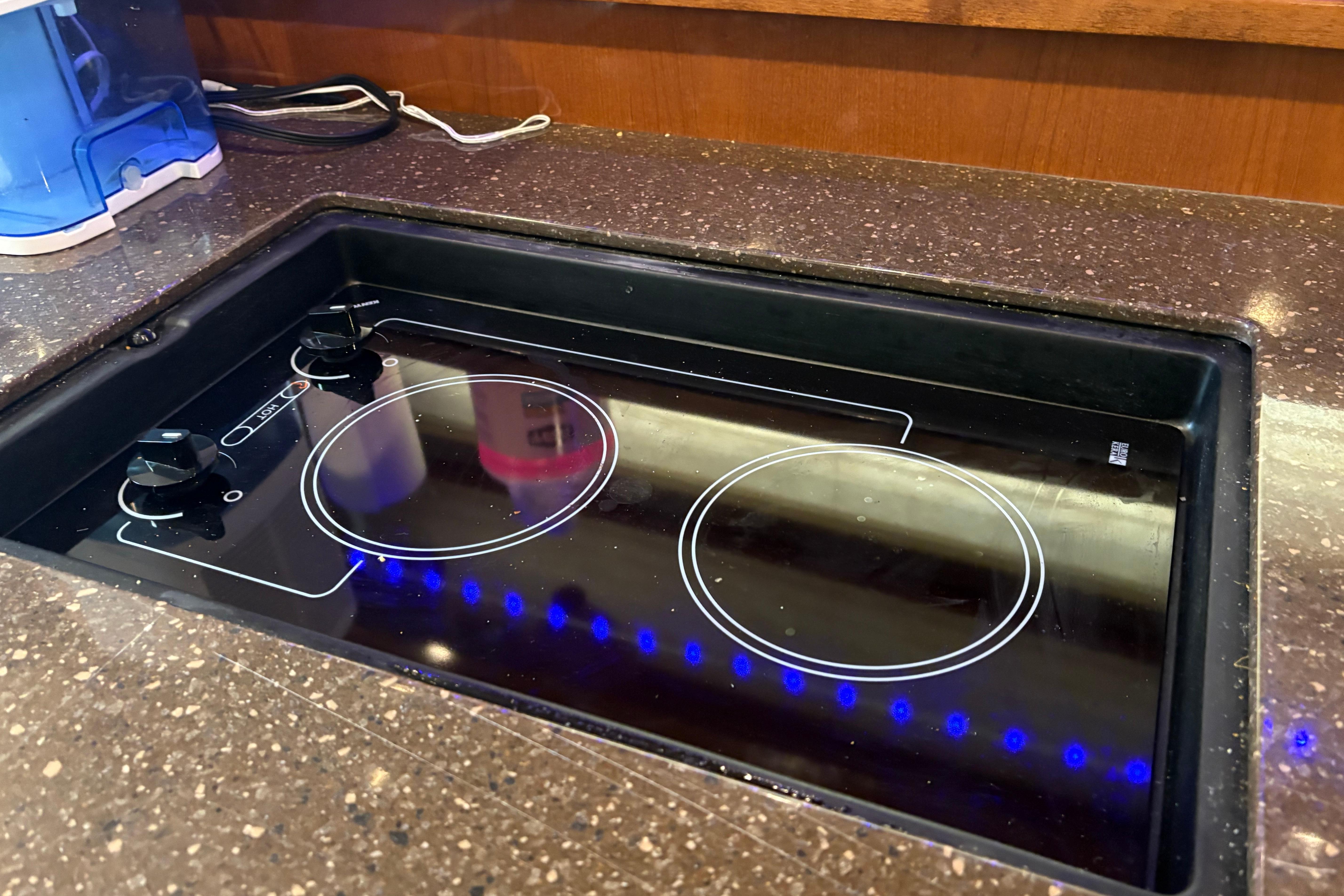 Galley: The onboard galley is equipped with essential appliances such as a microwave, electric stovetop, refrigerator with an icebox, and a sink.
