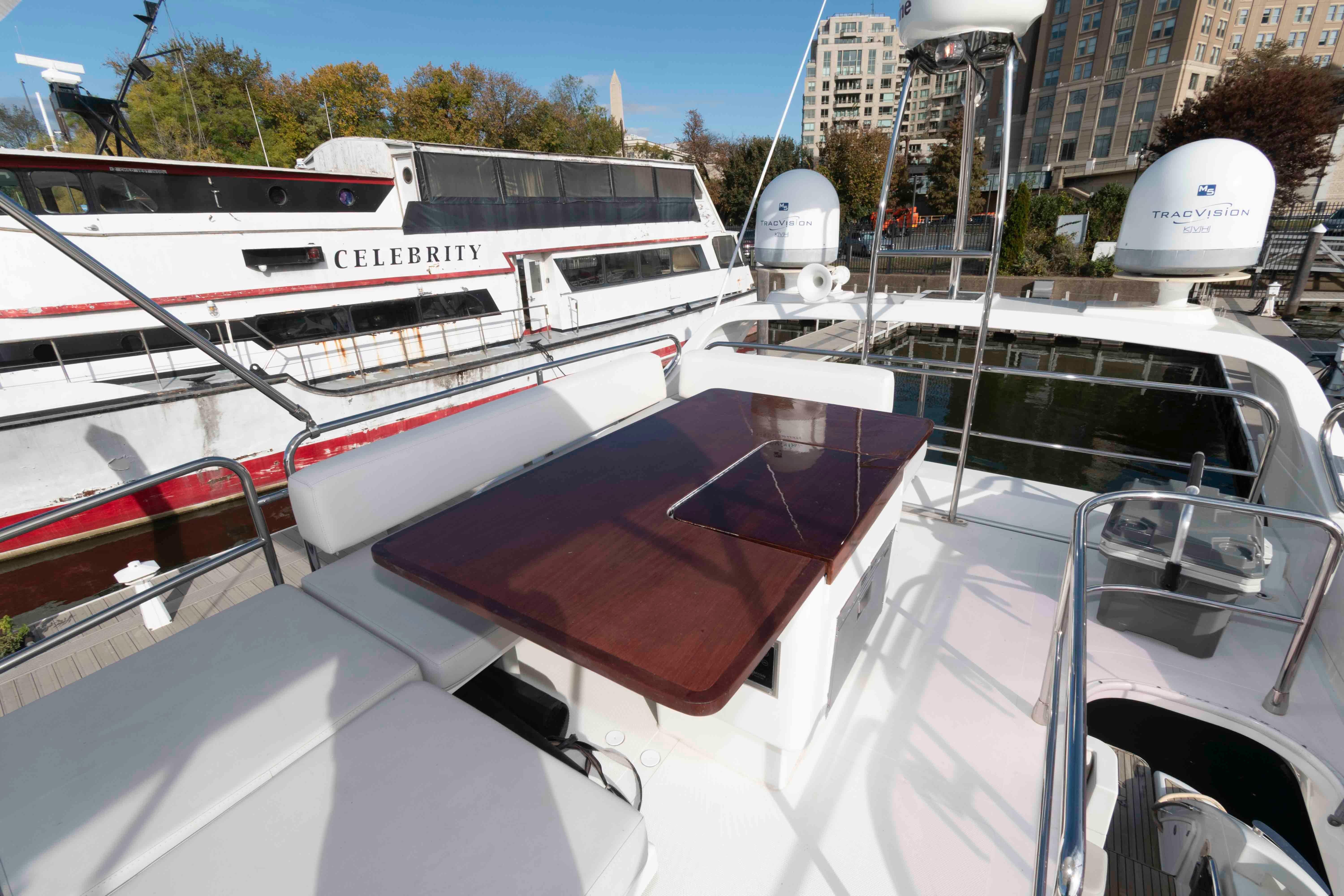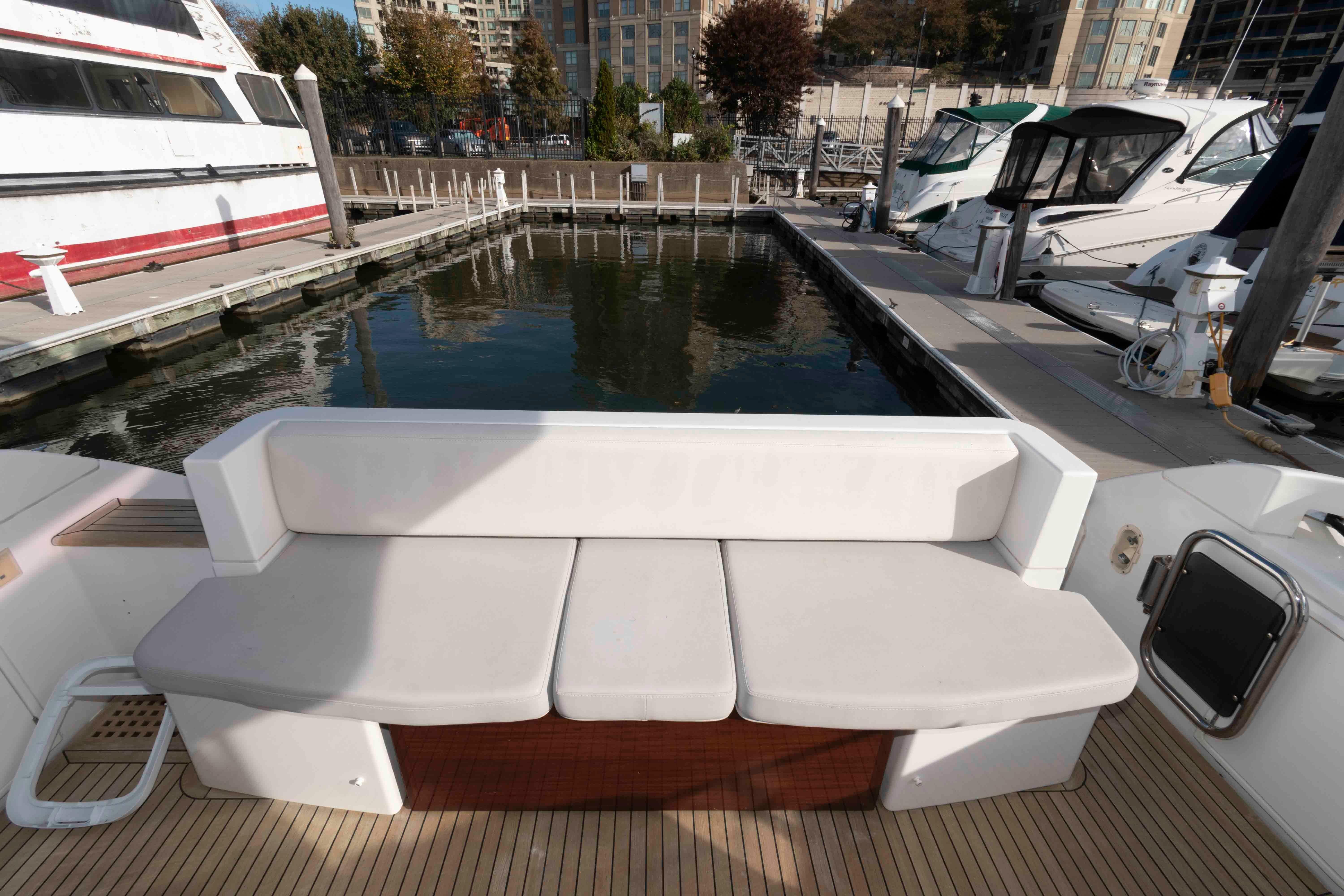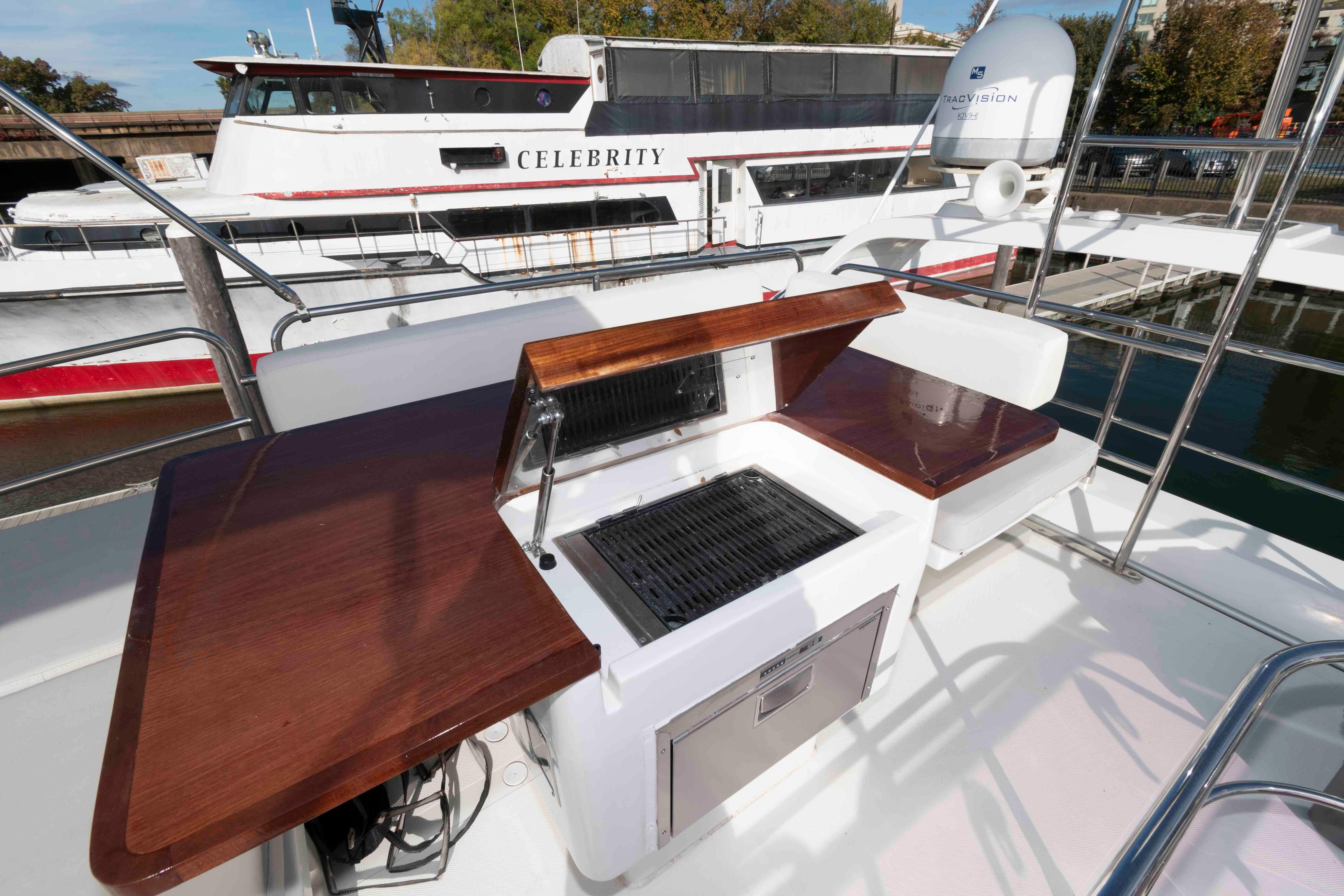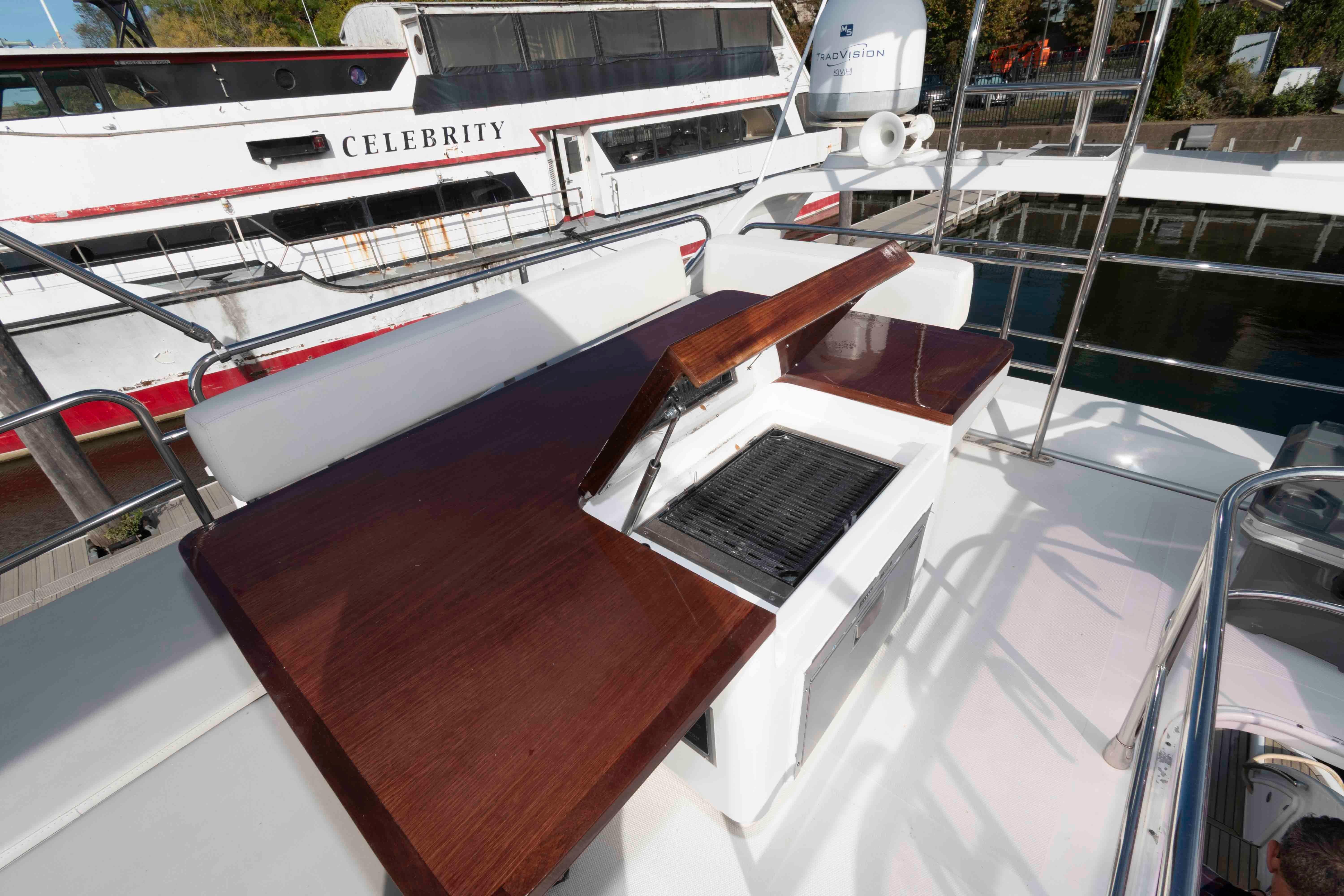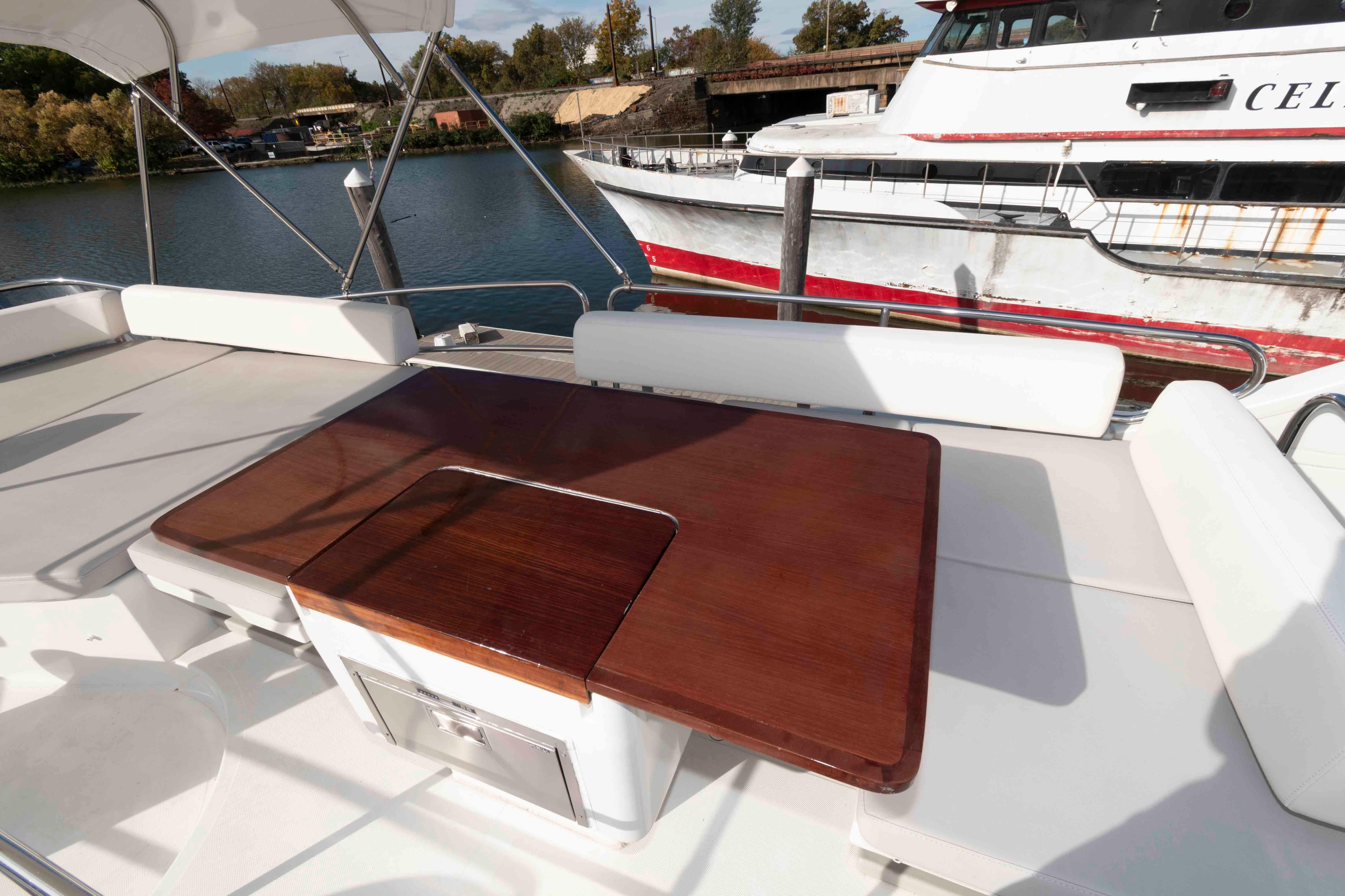 Spacious flybridge with seating, loungers, grill and wet bar