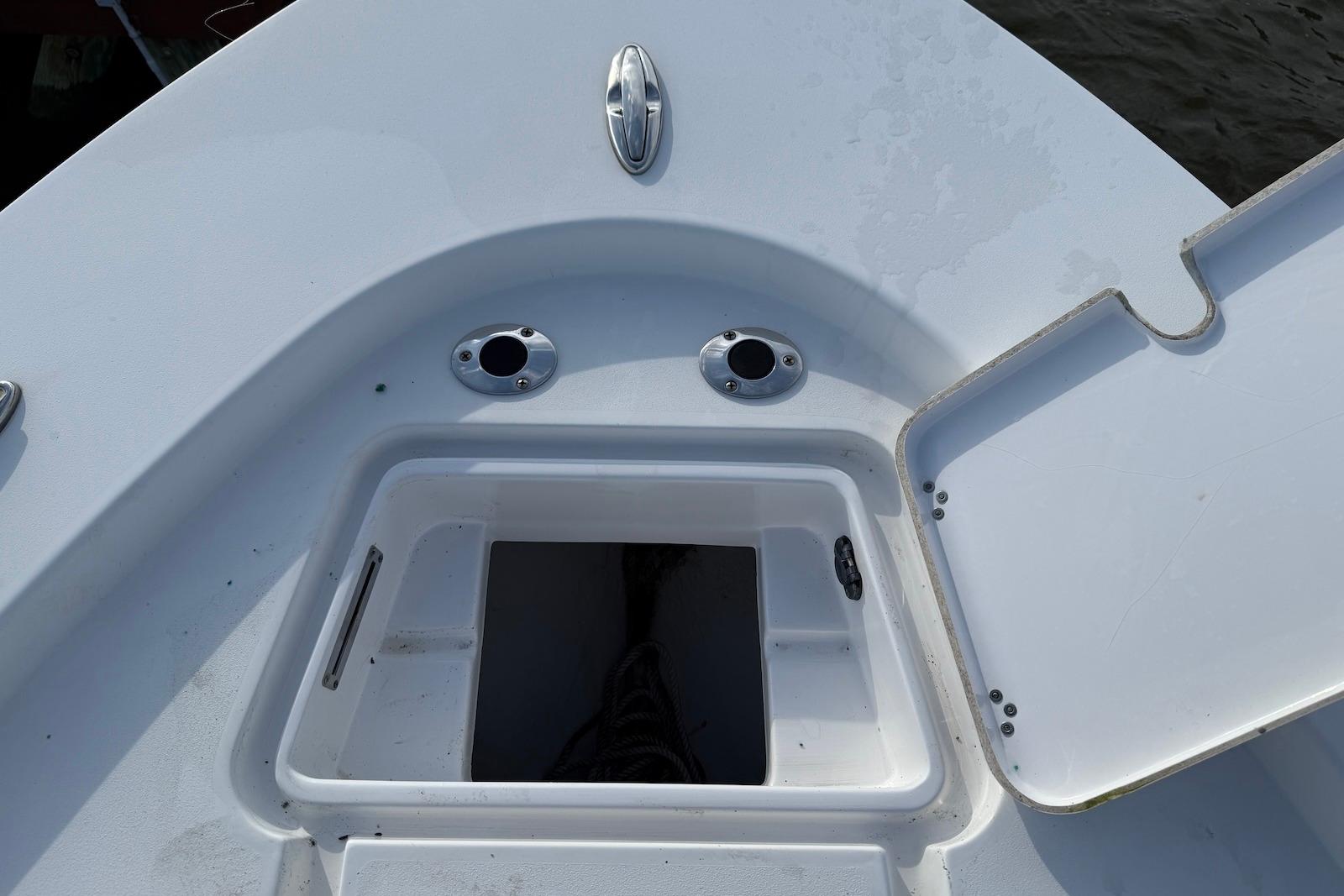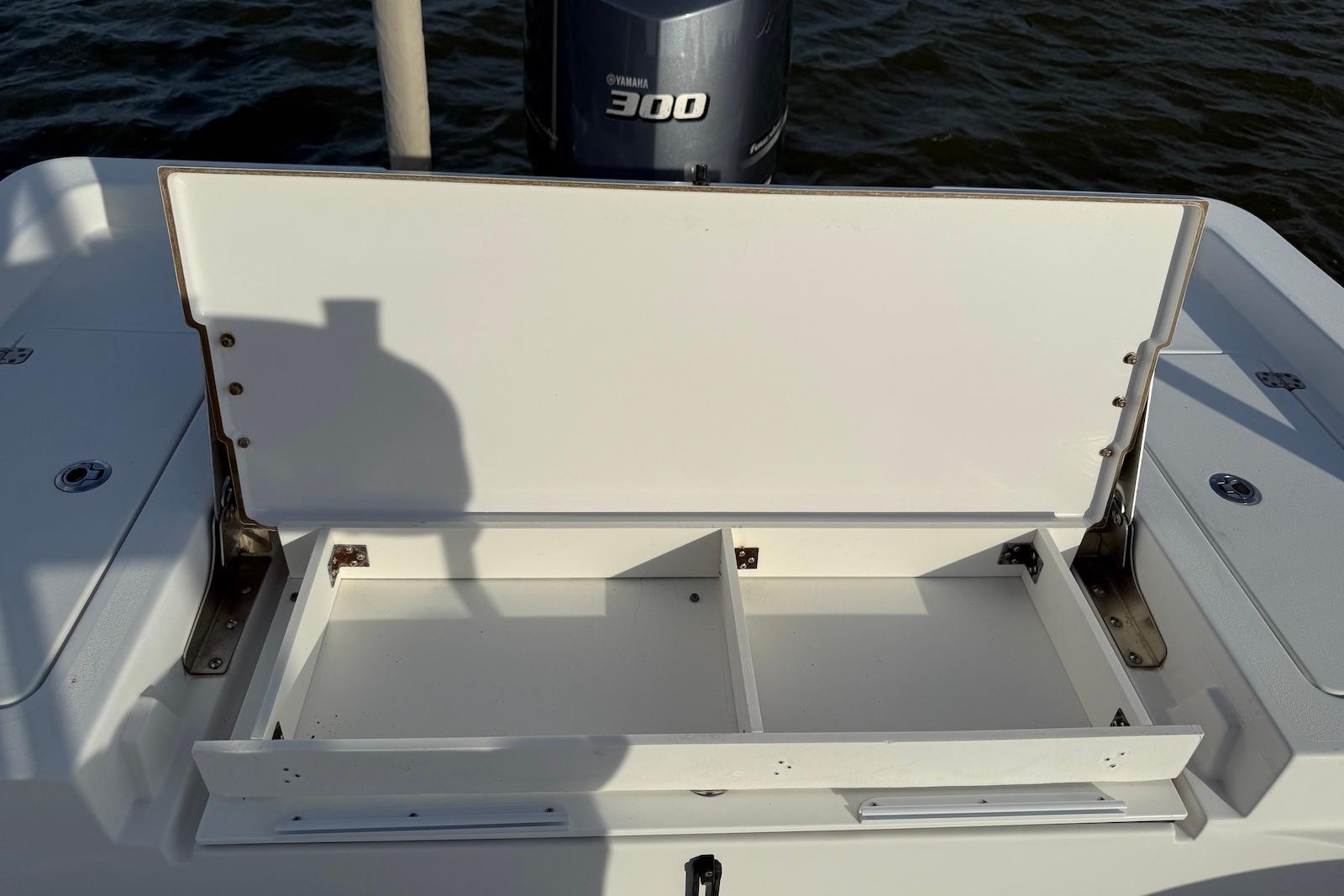 • Fishing Ready: Minn Kota 112lb Riptide trolling motor, 10’ power pole, livewell (30 gal aerated), twin insulated fish boxes (forward 180 qt & aft 120 qt), rod holders (8 gunwale-mounted), under-gunwale rod storage, and raw water washdown