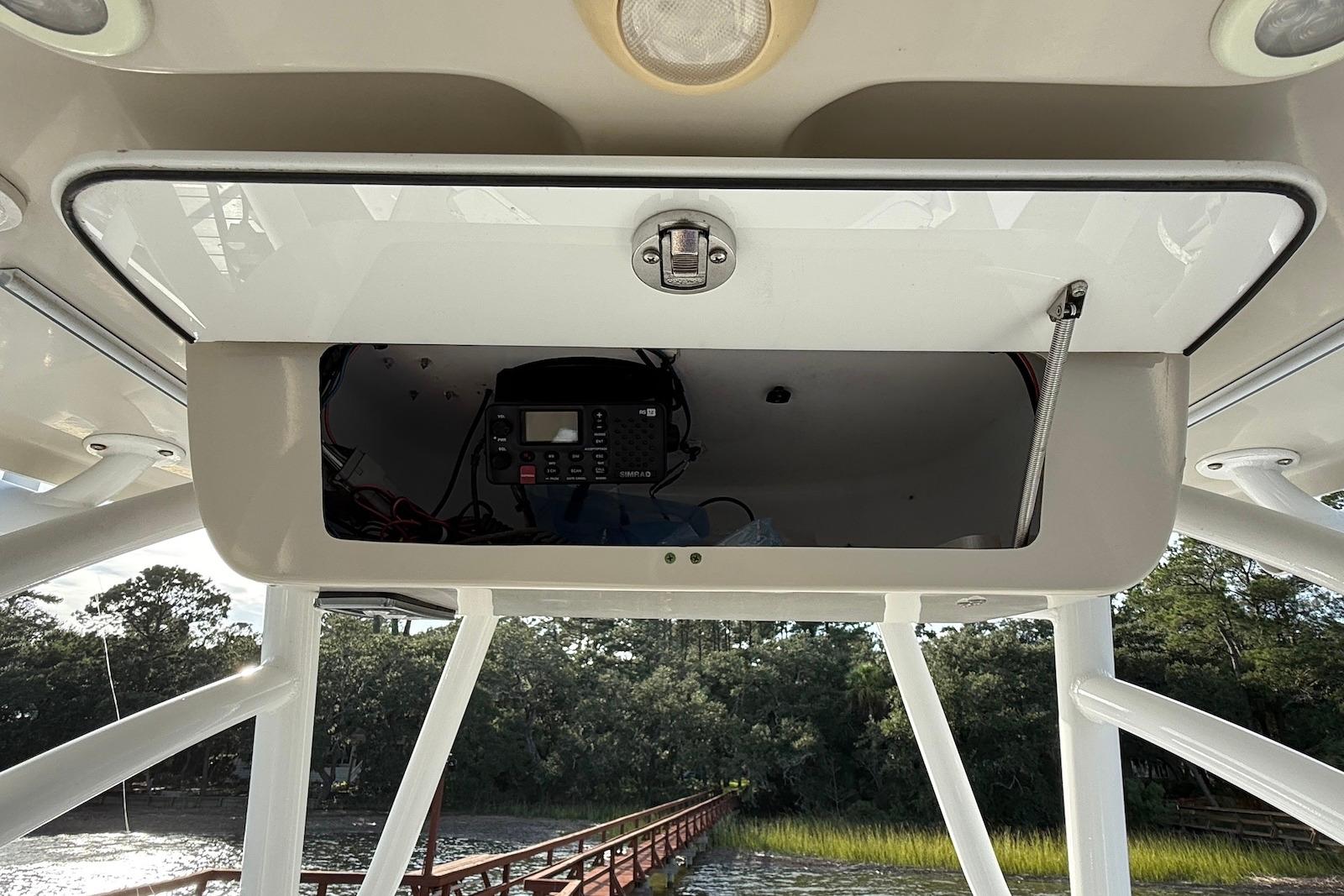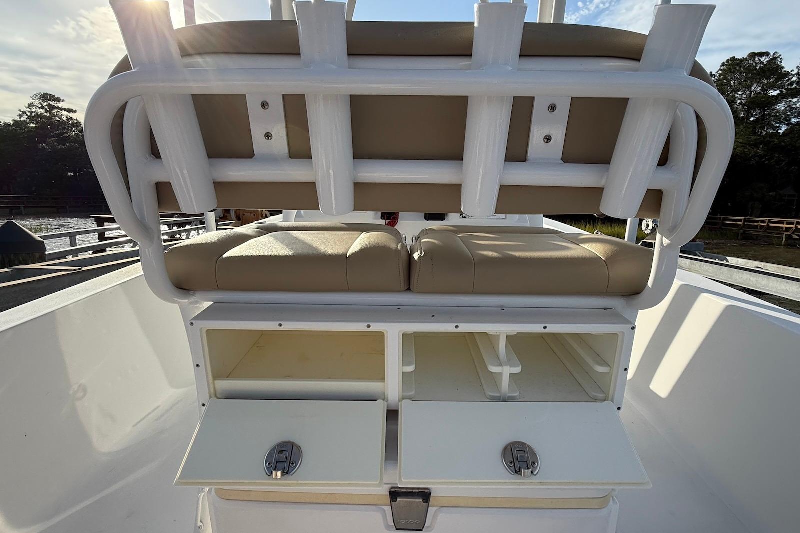 • Comfort Upgrades: Powder-coated T-top with rocket launchers, fiberglass T top, leaning post with cooler storage, and custom snap-on helm, captains chair, motor and power pole covers
