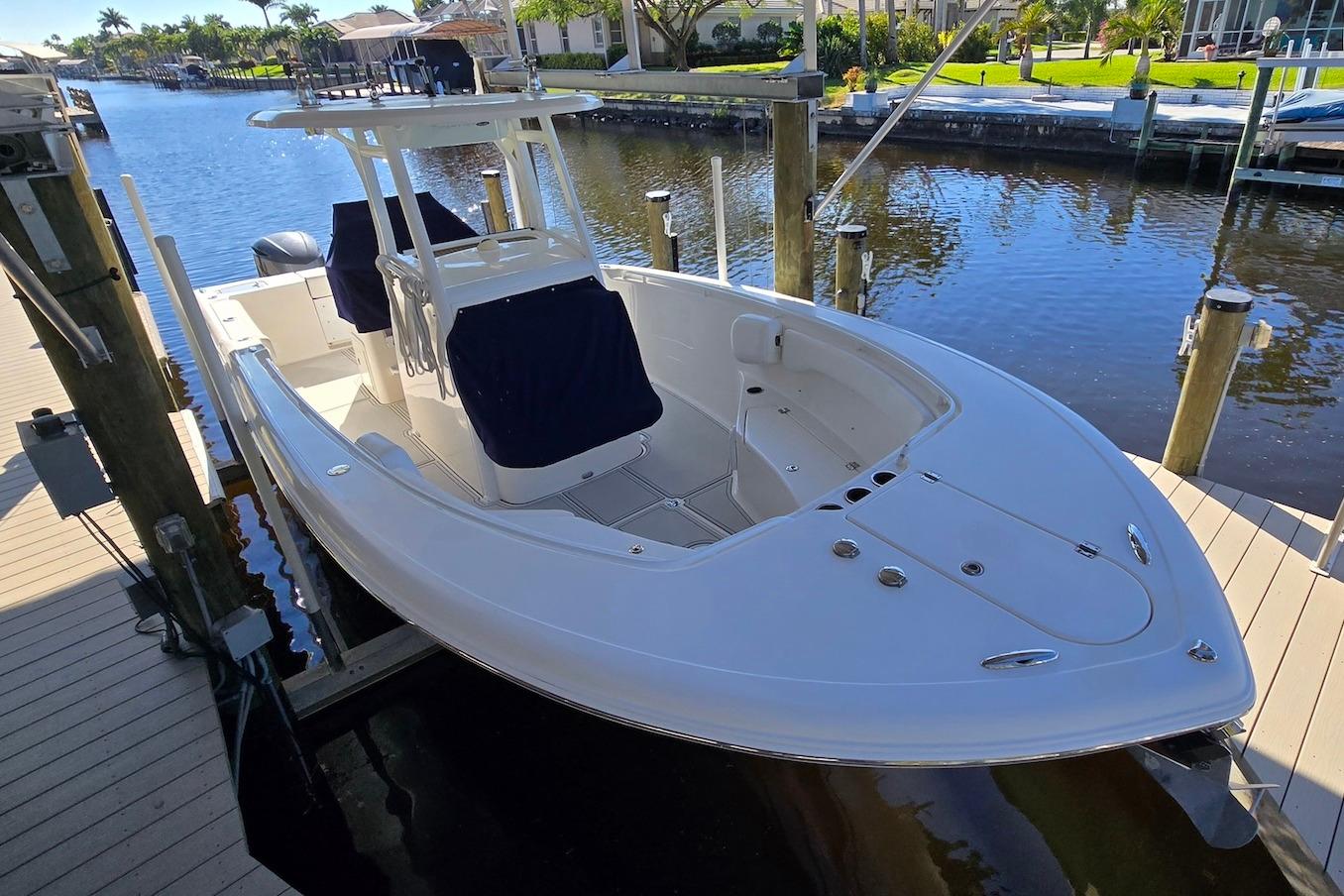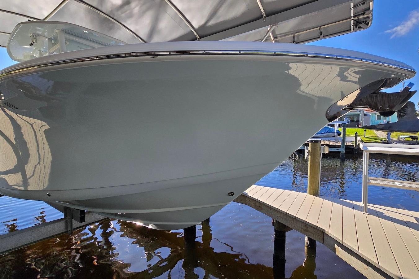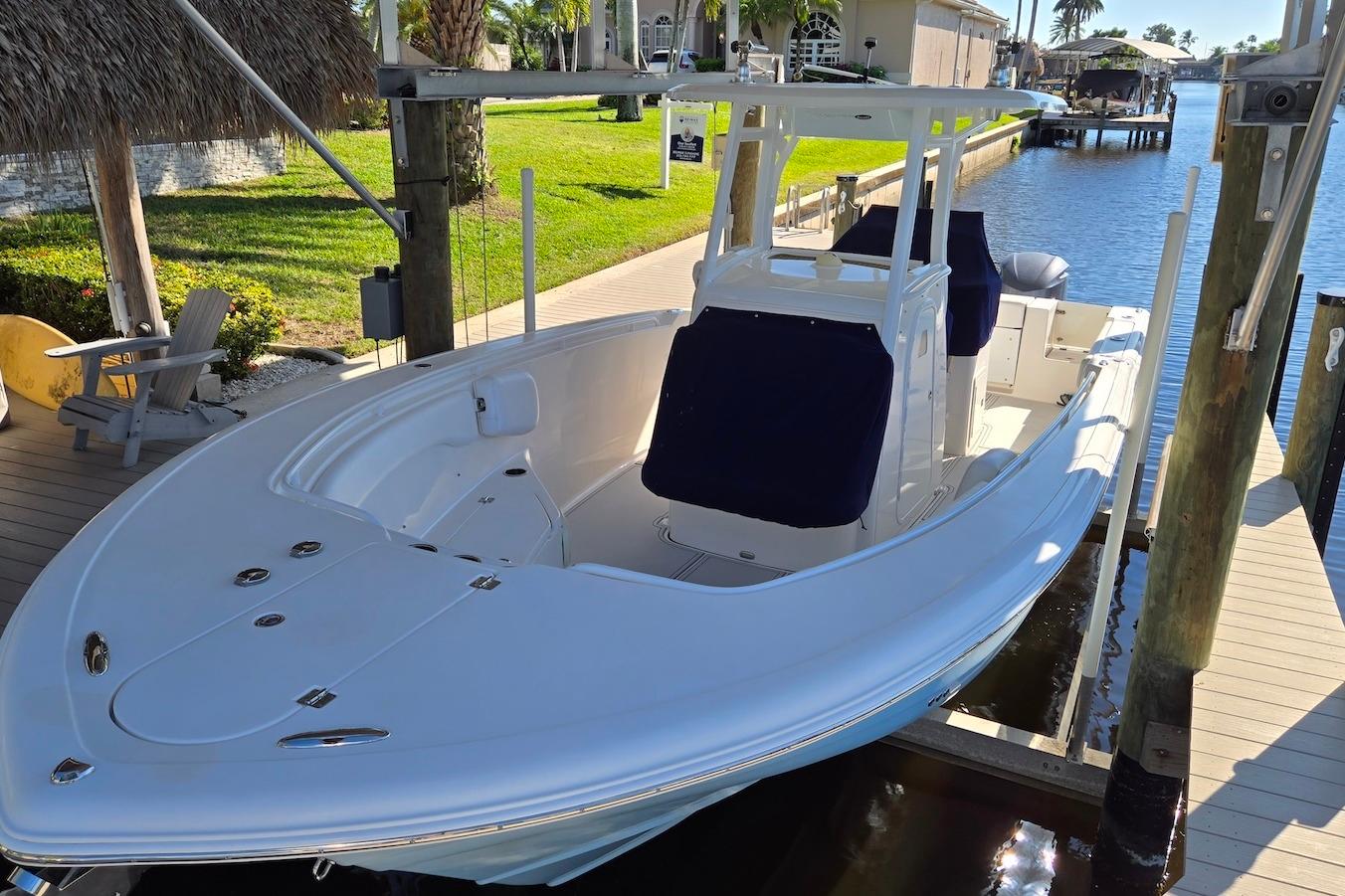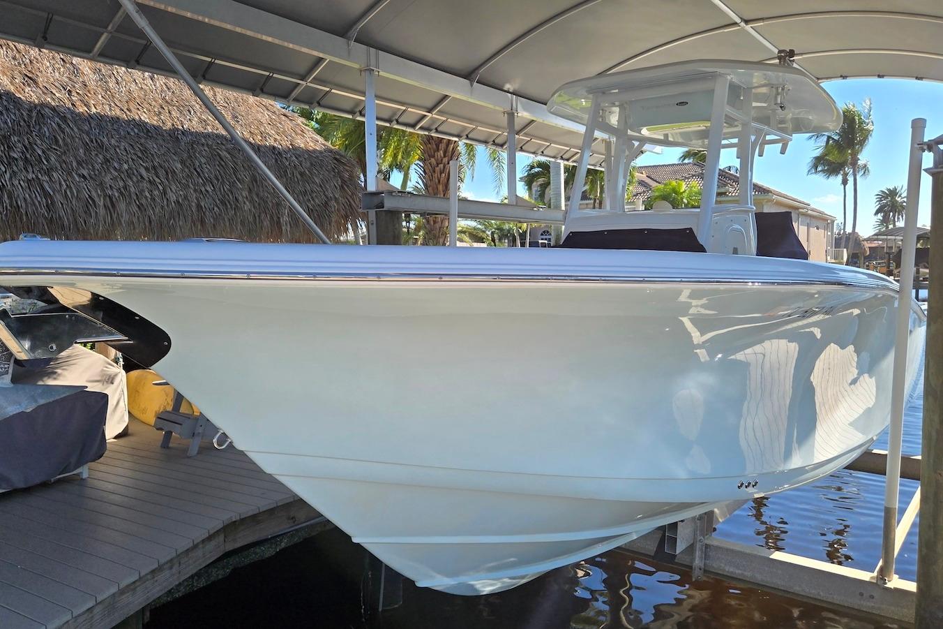 The spacious layout features a wide beam, deep-V hull, and an intelligently designed cockpit that provides excellent stability and comfort in rougher conditions. Forward seating with removable cushions, a large bow area, and ample storage make this boat equally well-suited for entertaining or fishing. Lift-kept, under cover and professionally maintained.