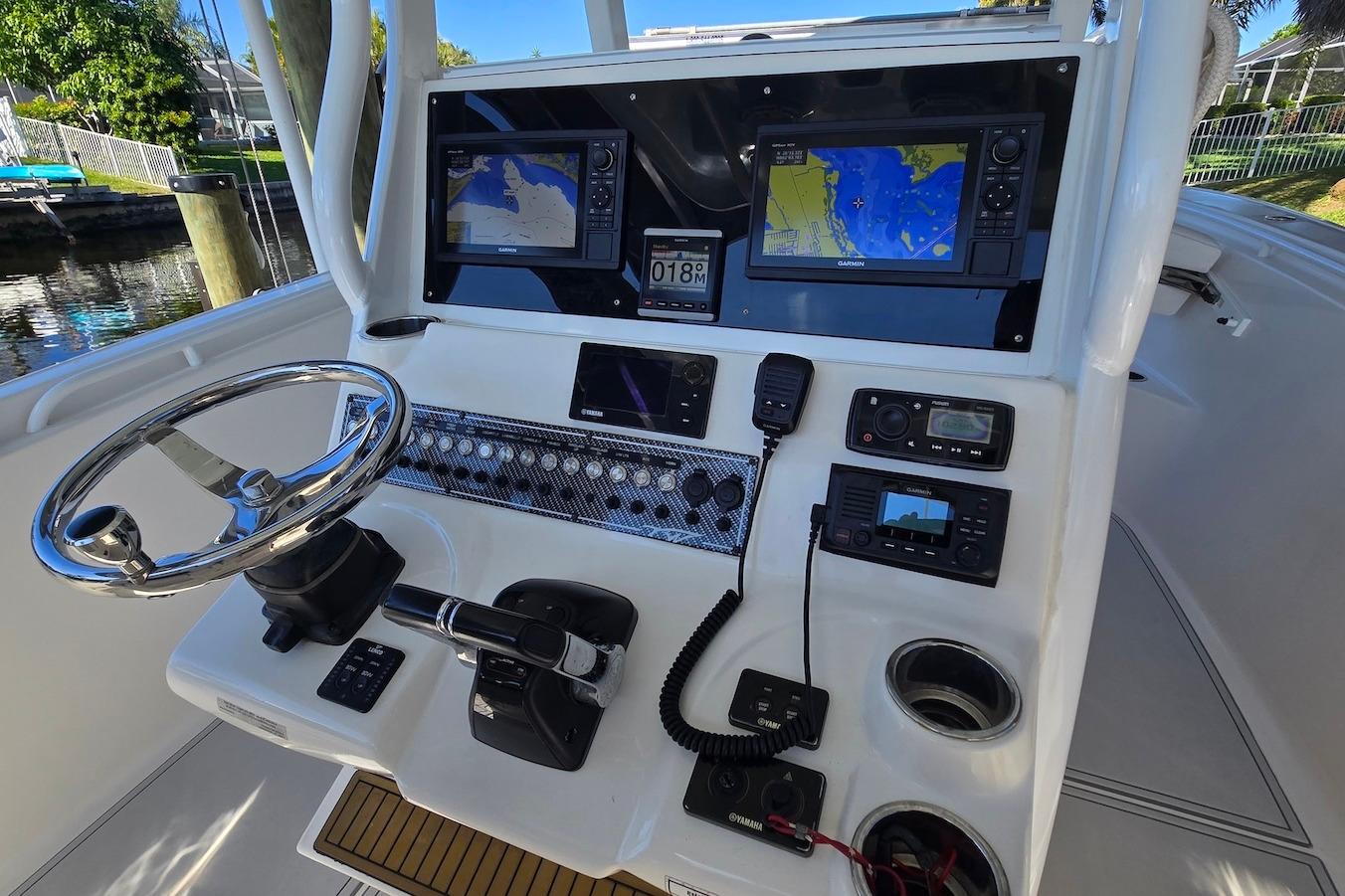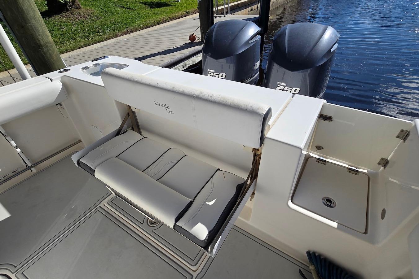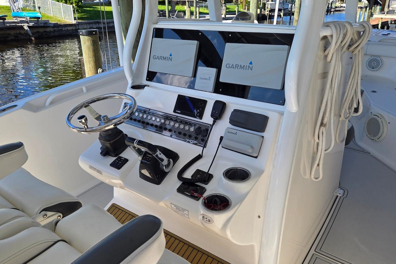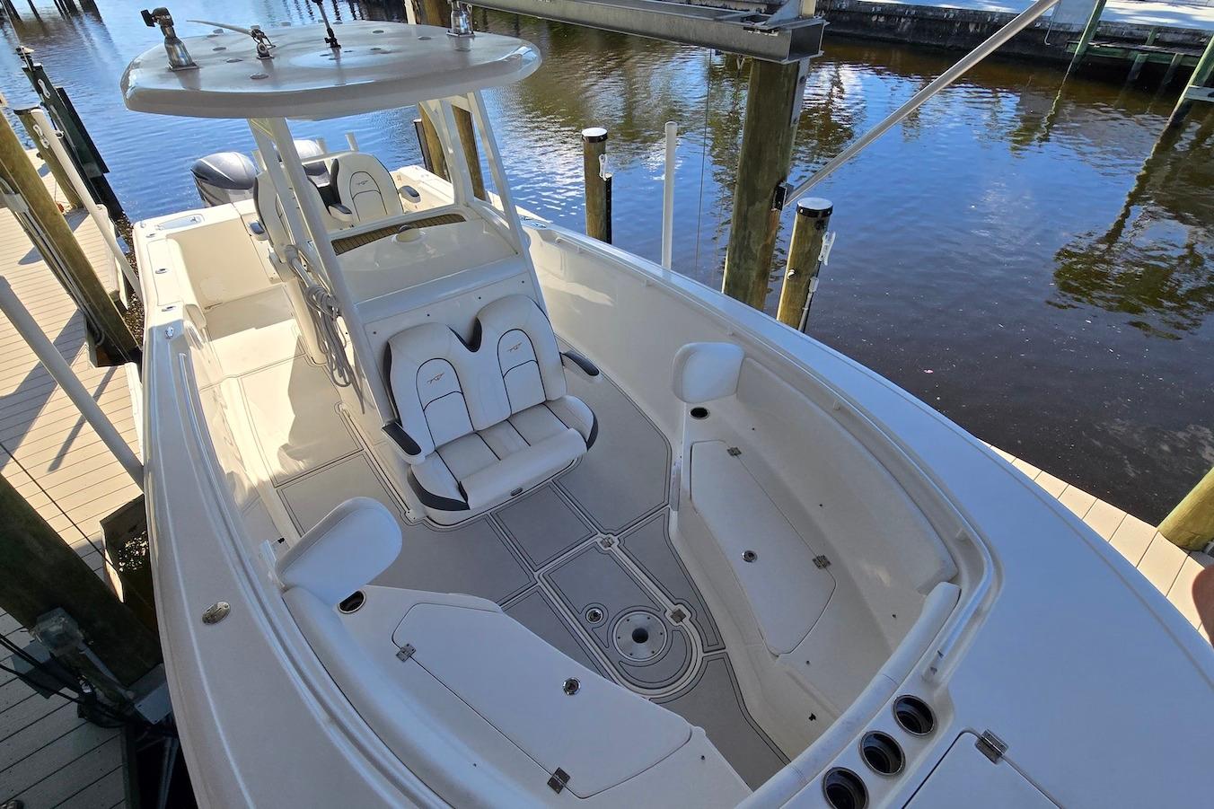 The spacious layout features a wide beam, deep-V hull, and an intelligently designed cockpit that provides excellent stability and comfort in rougher conditions. Forward seating with removable cushions, a large bow area, and ample storage make this boat equally well-suited for entertaining or fishing. Lift-kept, under cover and professionally maintained.