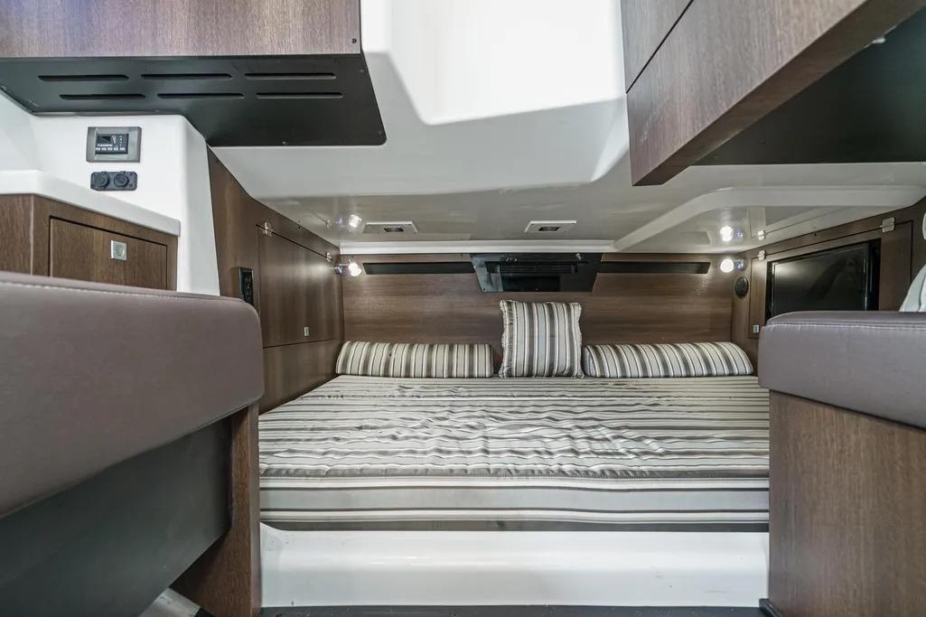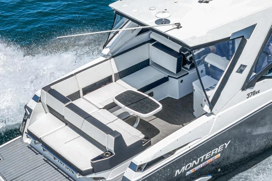 The Monterey 378 SE combines the ideal day yacht configuration with overnight capabilities. Above deck, you'll find a big, open layout with a large cockpit and bow seating spaces, as well as an L-Lounge with Sun-Island seating, allowing for the perfect setting for any of your boating needs. Below deck, a tastefully outfitted cabin greets you with accommodations to comfortably sleep 2, making overnight trips enjoyable and relaxing.