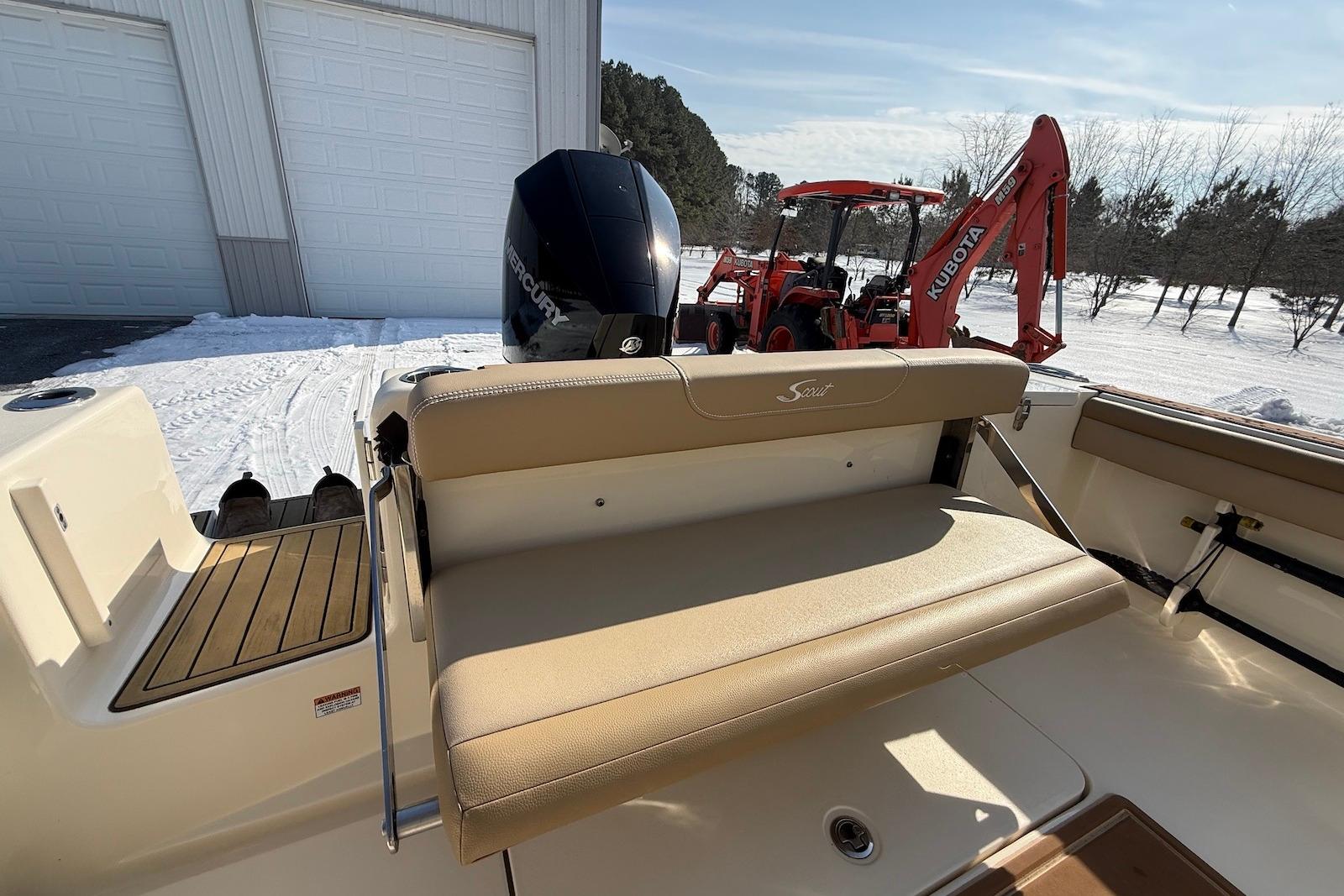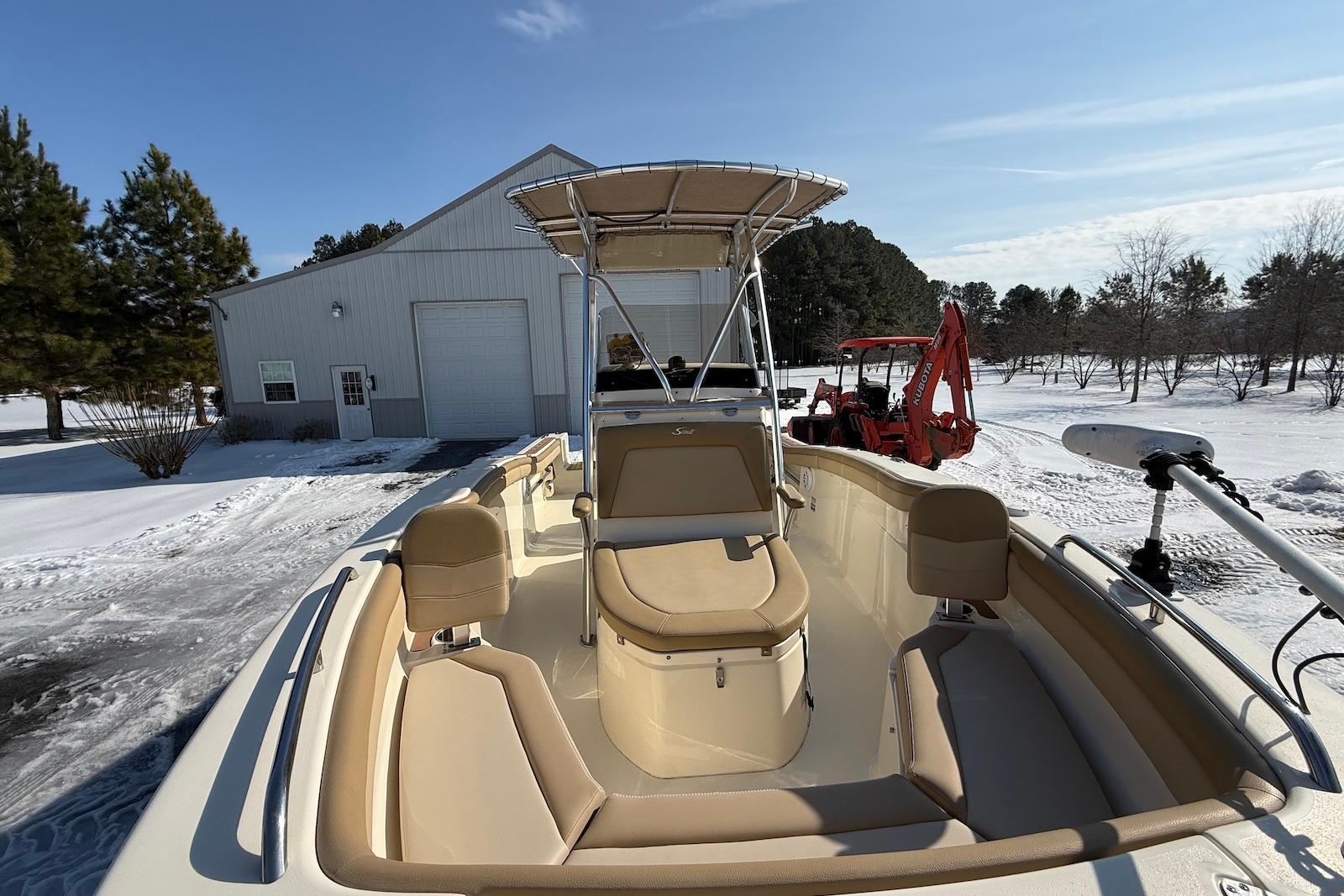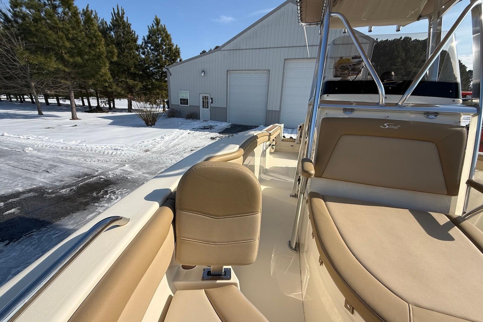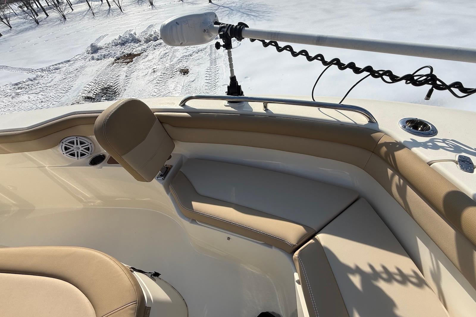 The 215 XSF is built on Scout’s revolutionary fuel saving NuV3 hull design, while the deck offers ample standard amenities for everything from serious fishing to comfort cruising. Built with 100% hand-laid fiberglass, the boat boasts a wide comfortable beam of 8’ 6” with an overall length of 21’ 6”. A notable standard feature onboard the 215 includes not only the forward seating in the bow, but also a forward sun lounge/coffin box complete with a cushion.
