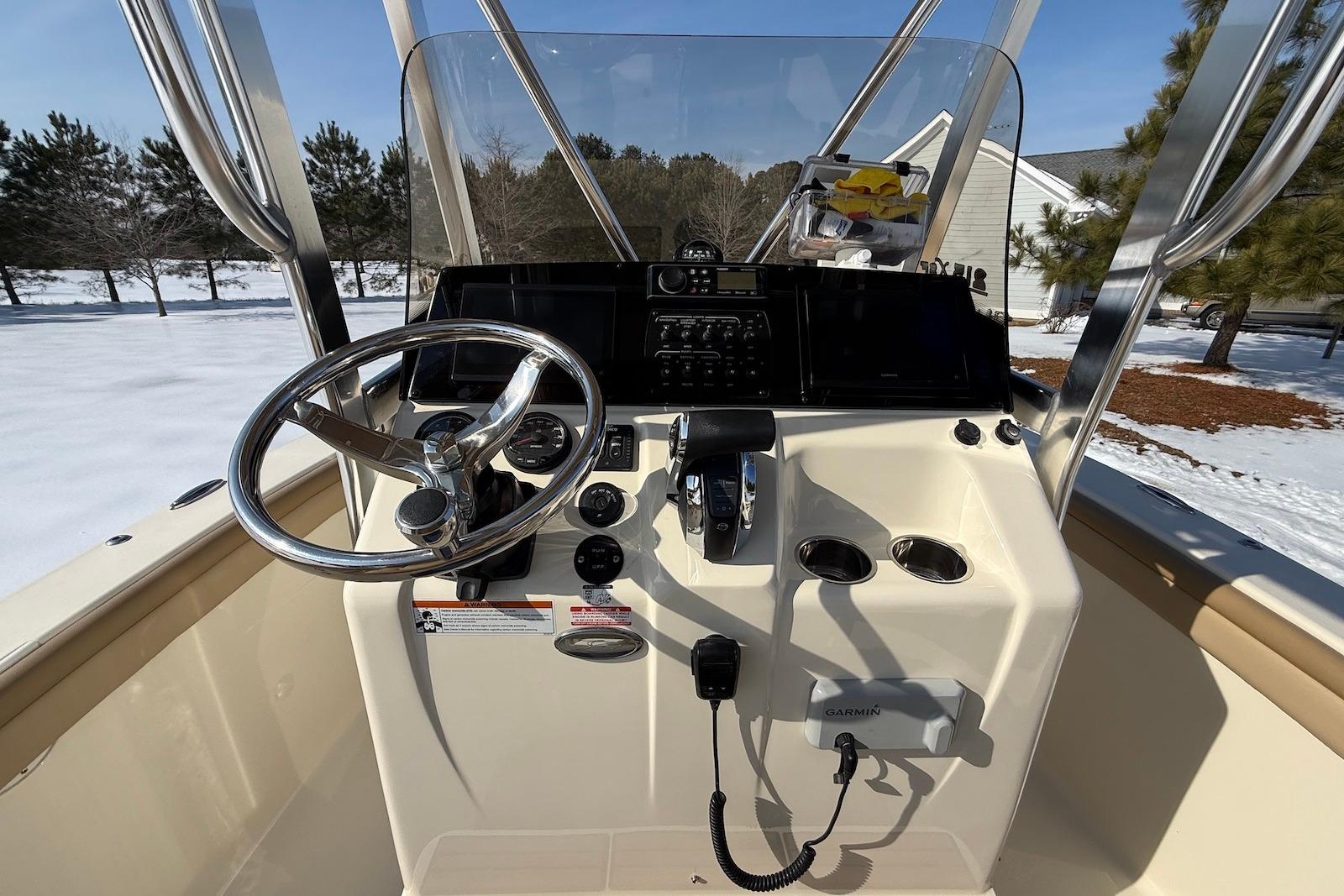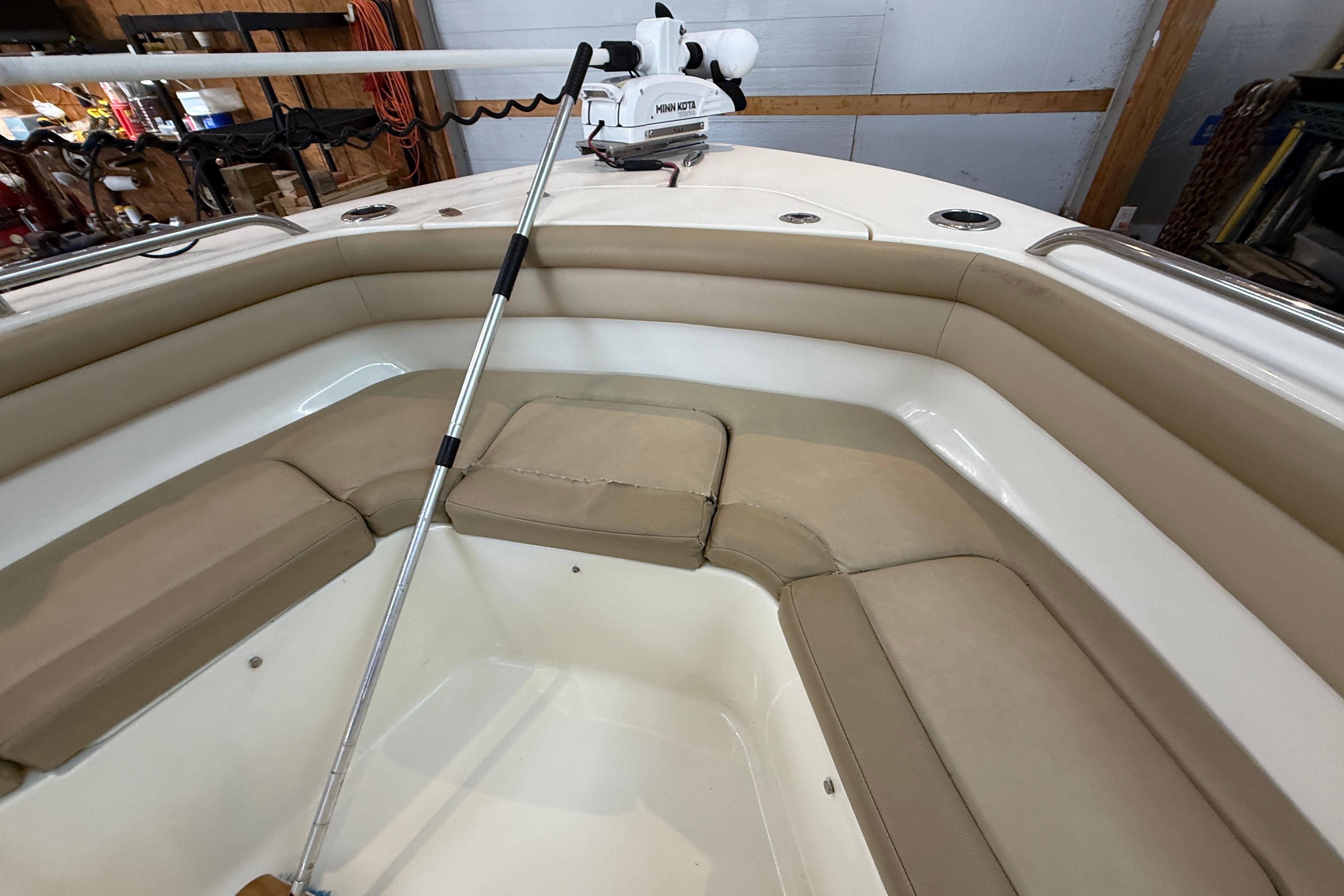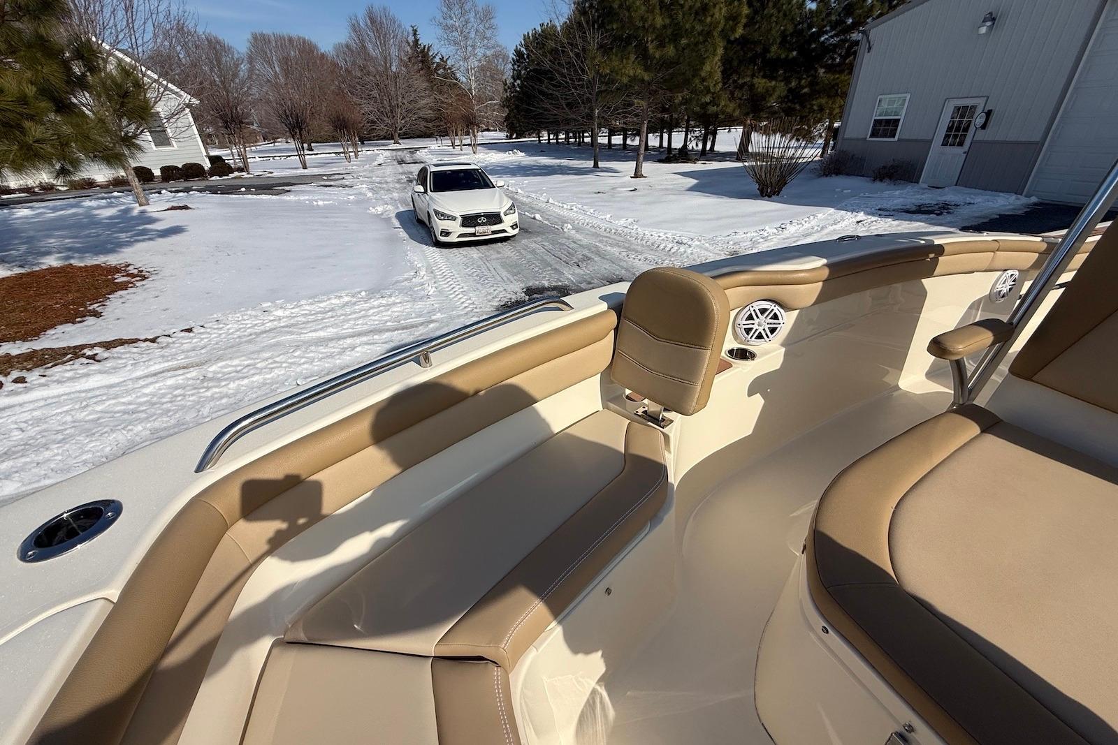 The 215 XSF is built on Scout’s revolutionary fuel saving NuV3 hull design, while the deck offers ample standard amenities for everything from serious fishing to comfort cruising. Built with 100% hand-laid fiberglass, the boat boasts a wide comfortable beam of 8’ 6” with an overall length of 21’ 6”. A notable standard feature onboard the 215 includes not only the forward seating in the bow, but also a forward sun lounge/coffin box complete with a cushion.