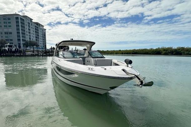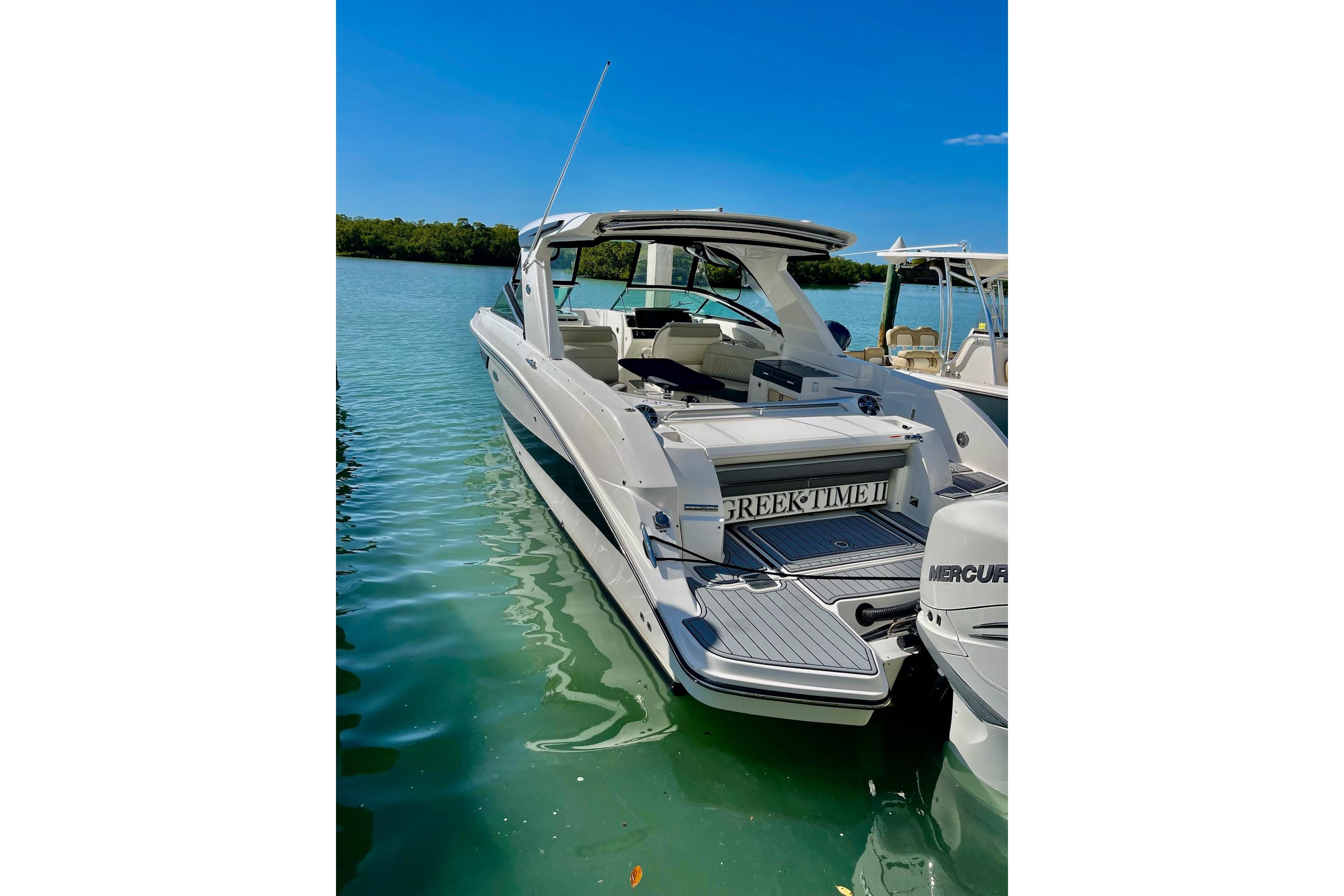 - Premium Canvas package: Full bow and cockpit cover. Forward Isenglass enclosure that offers coverage from the hardtop and spoiler to the windshield. She also has an aft camper cover that offers coverage from the hardtop to swim platform.