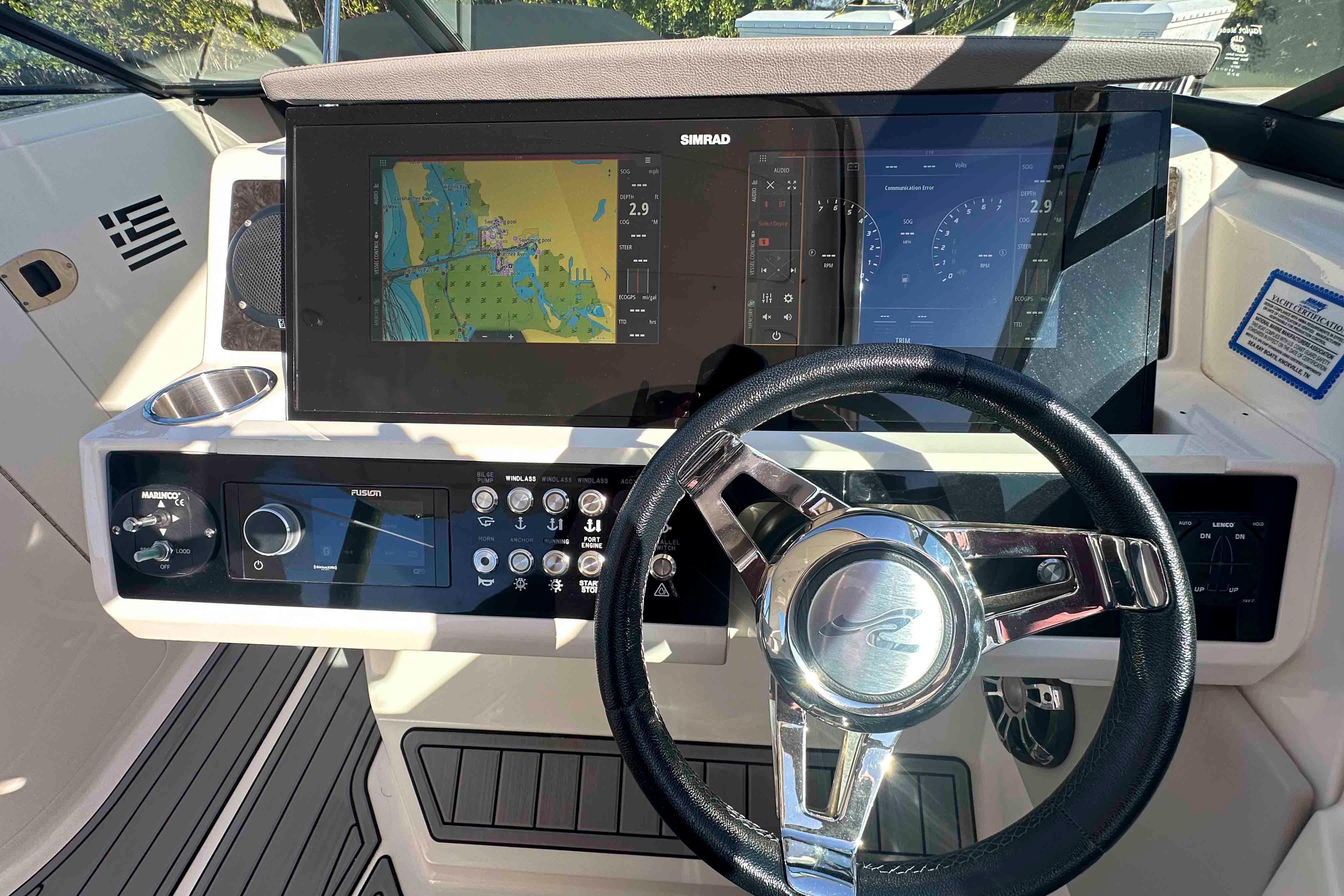 - State-of-the-Art Helm: Navigate with confidence using dual 12" Simrad touchscreen displays with integrated Mercury VesselView, lighting controls, and joystick piloting for effortless control and docking.