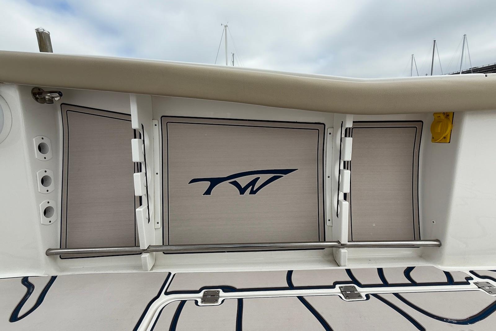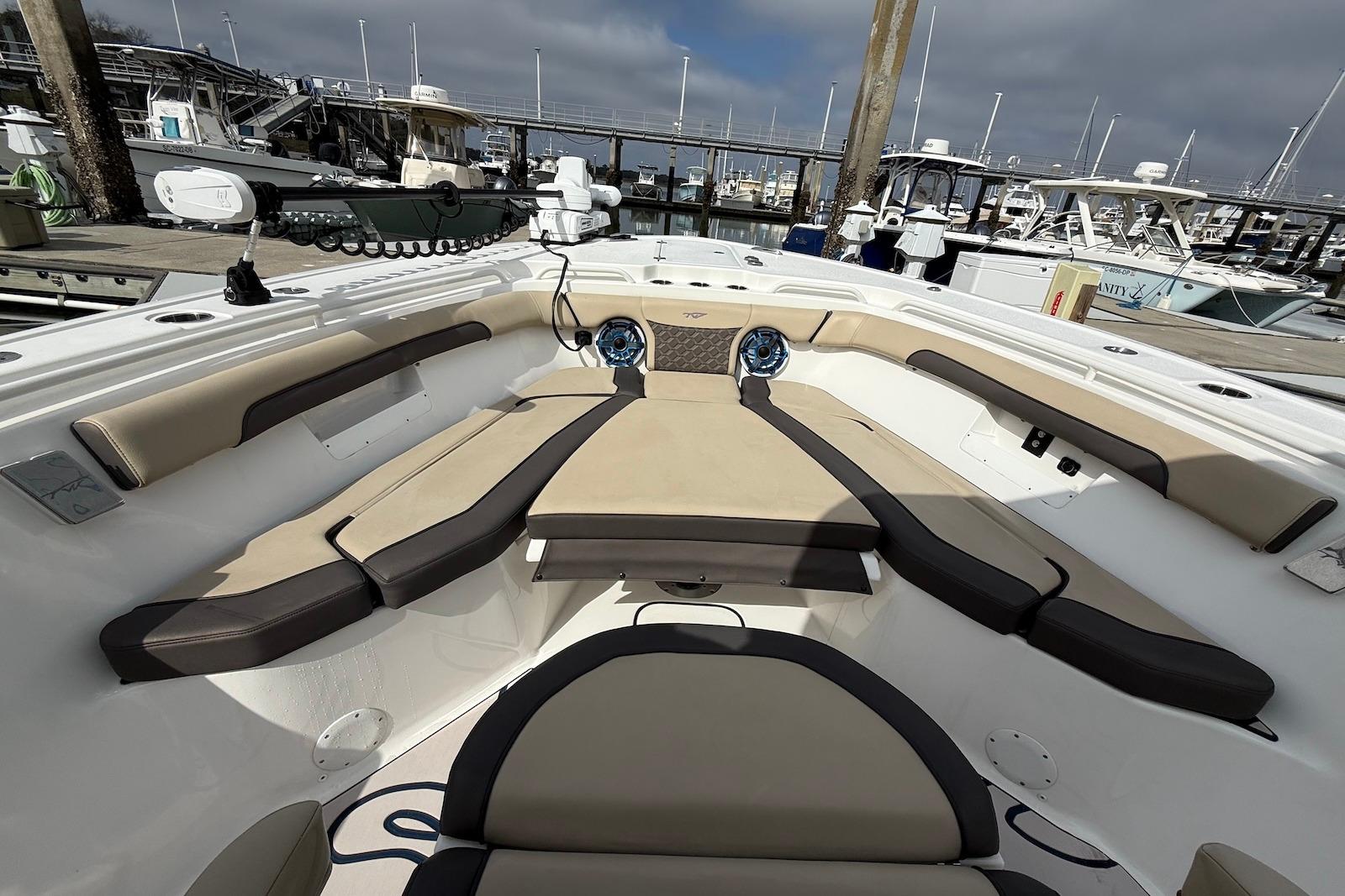 - Seating & Amenities: Features wrap-around bow seating with flip-out backrests, an electric high-low bow table, a side tuna door, and a spacious head with an electric flush toilet.