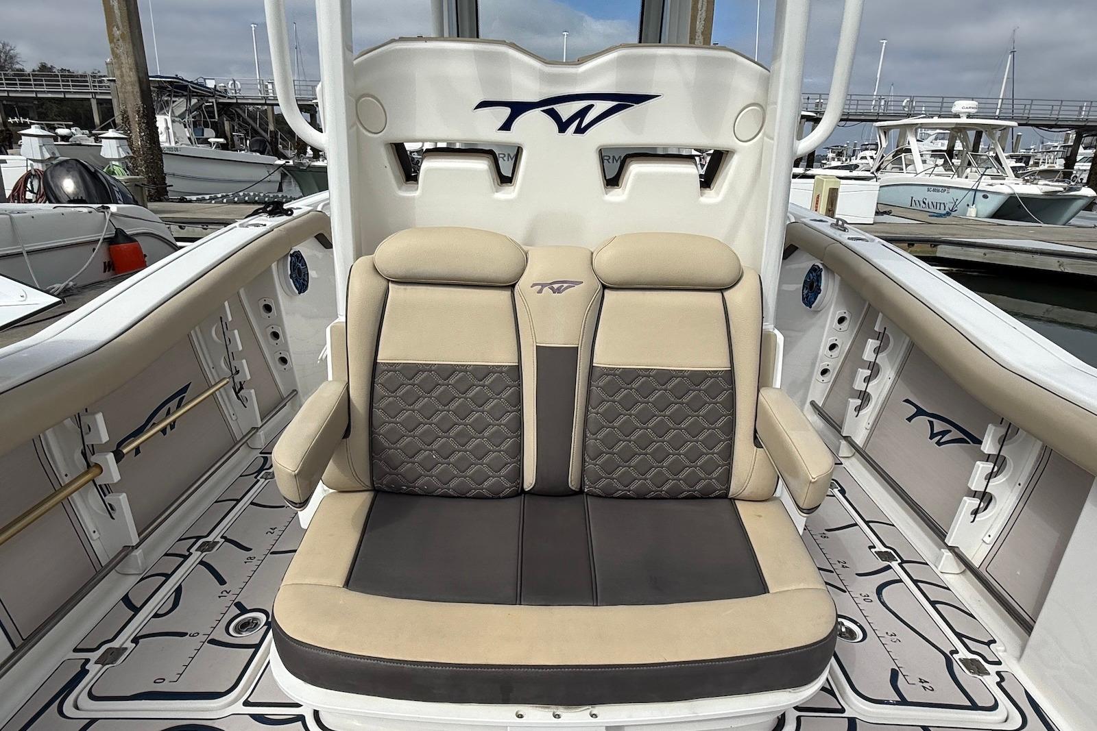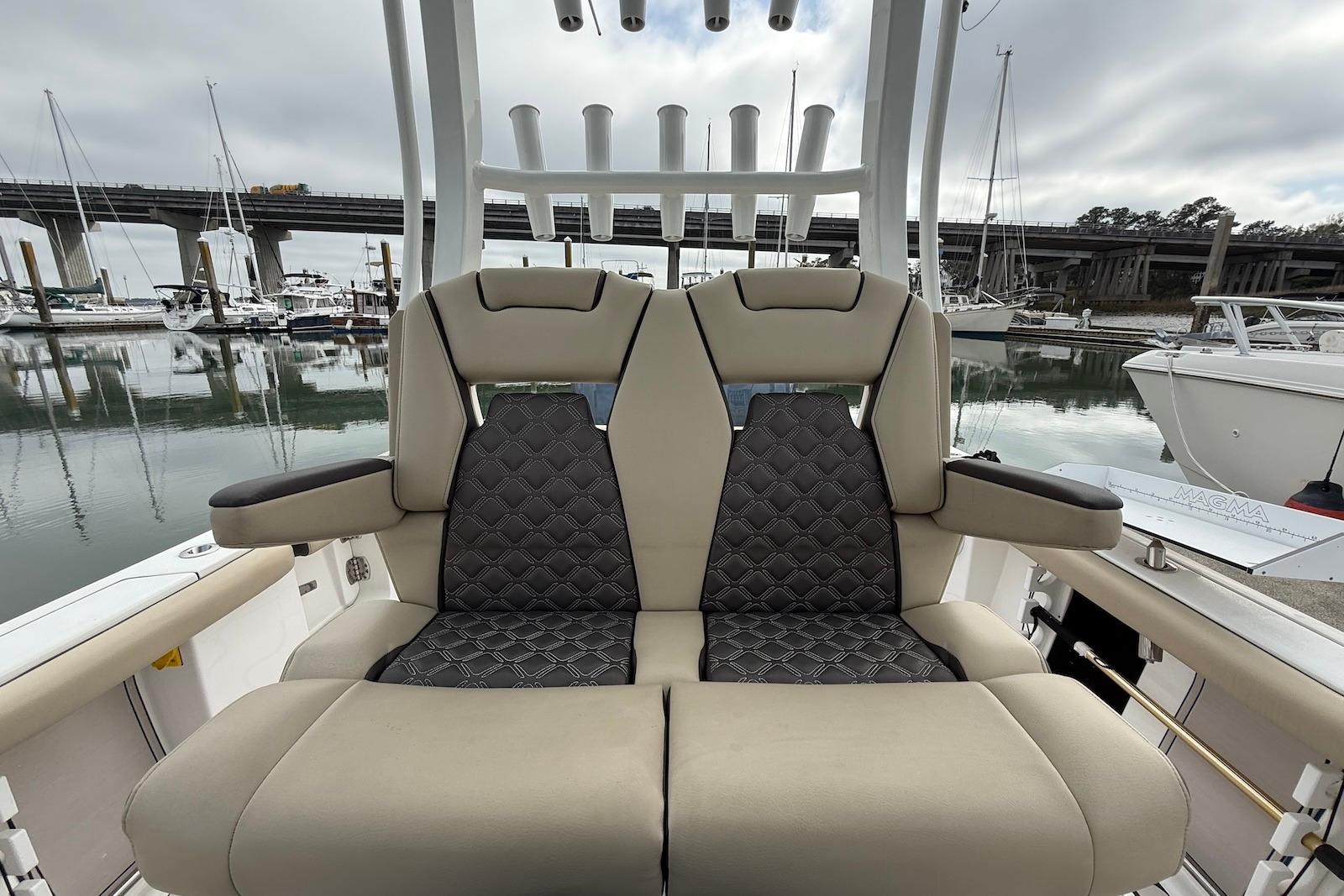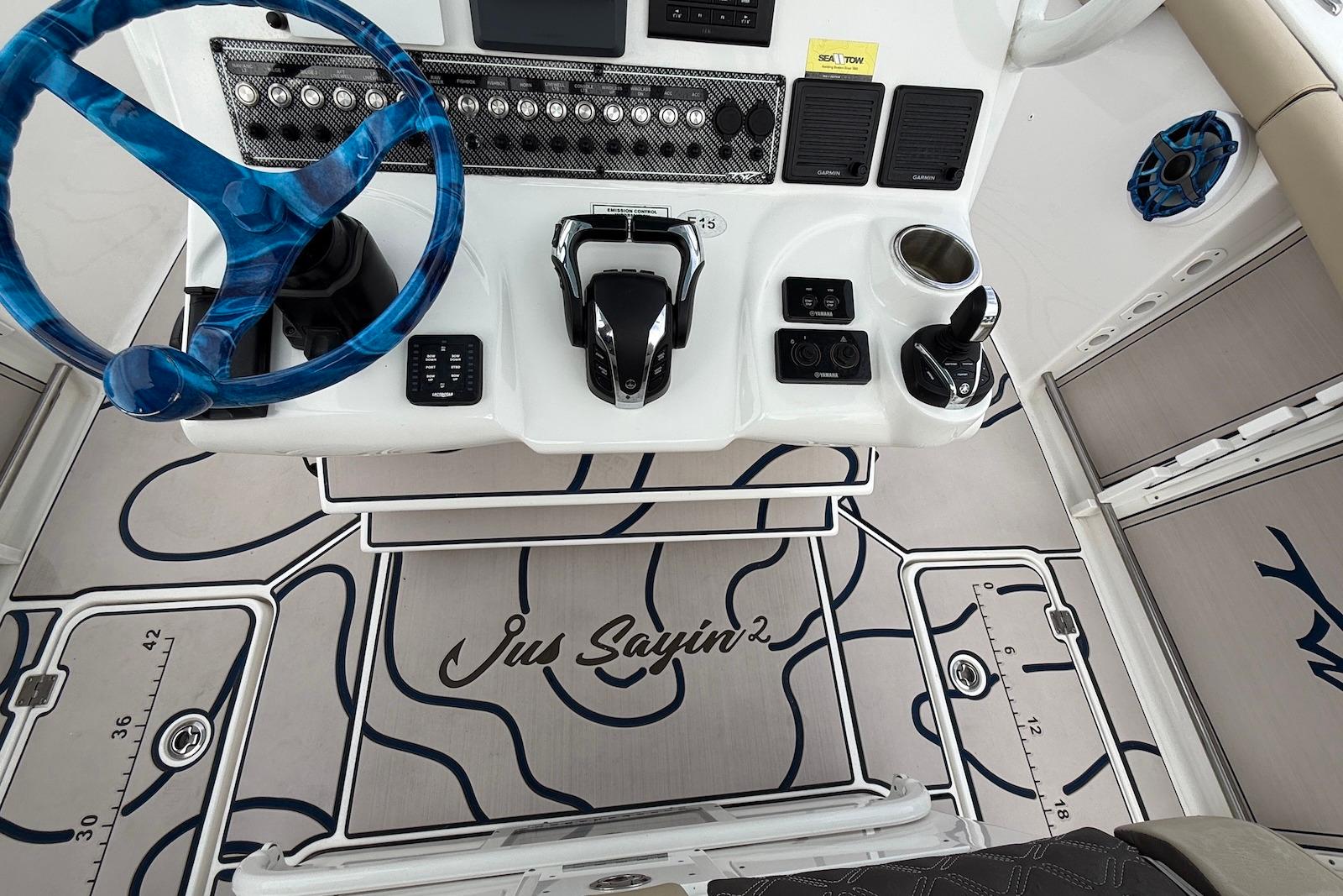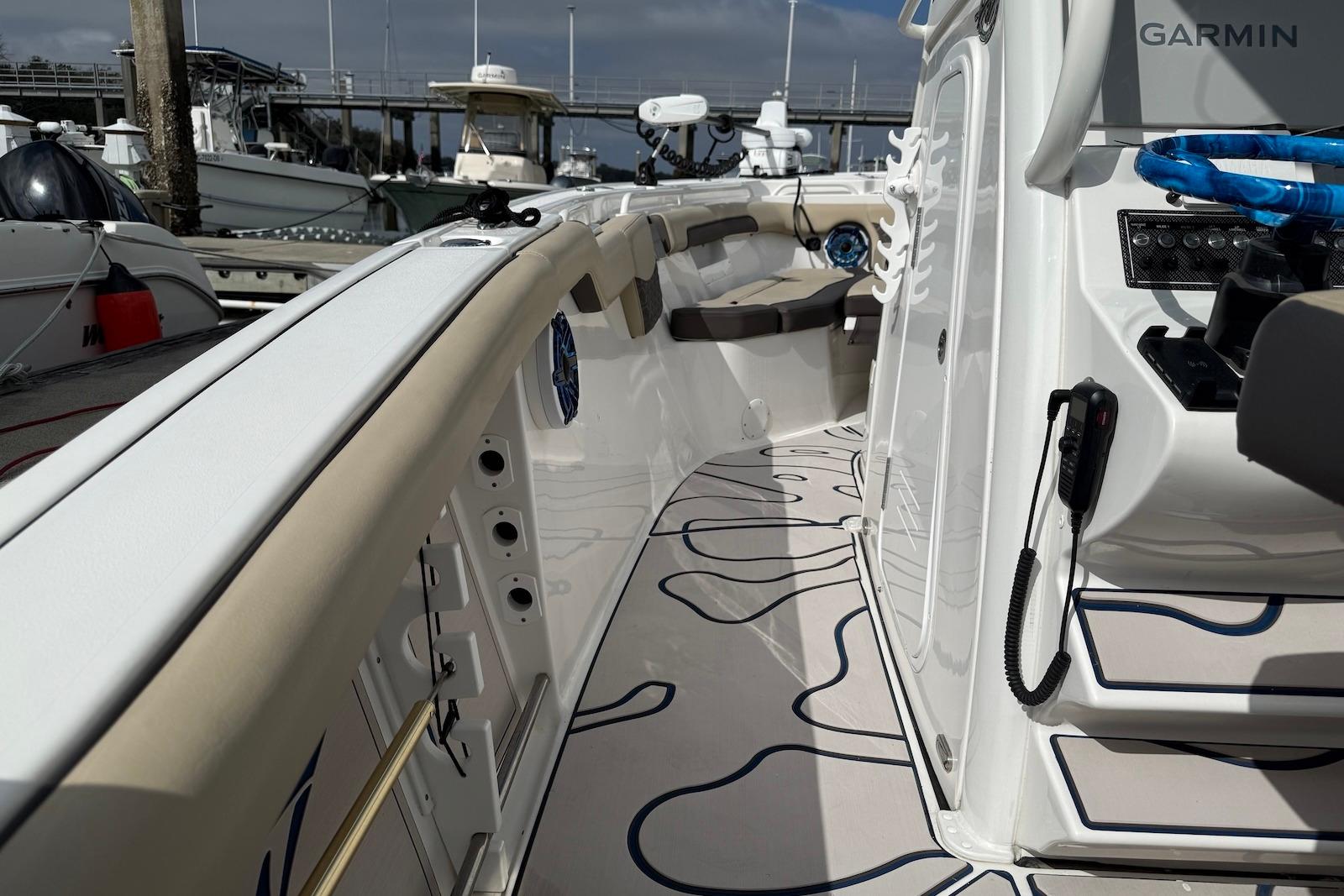 - Premium Electronics: High-end dash featuring Dual Garmin 8616xsv touchscreen displays, Garmin HD radar, twin Garmin GHS11 VHF radios