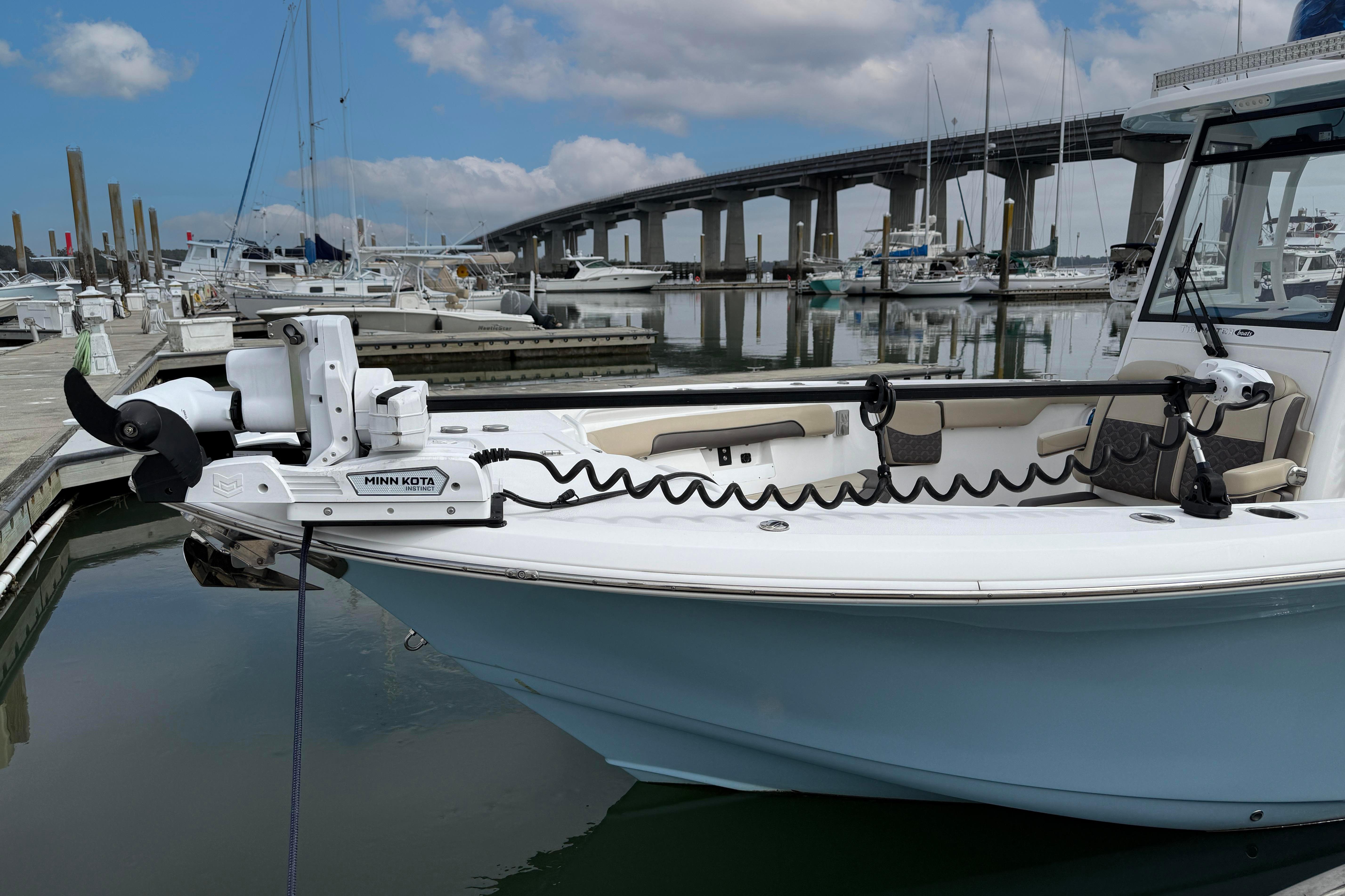 - Offshore Gear: Outfitted with a fiberglass hardtop with integrated spreader lights, Gemlux outriggers with carbon fiber poles, and multiple stainless steel rod holders. MinnKota Instinct 24/36v trolling motor
