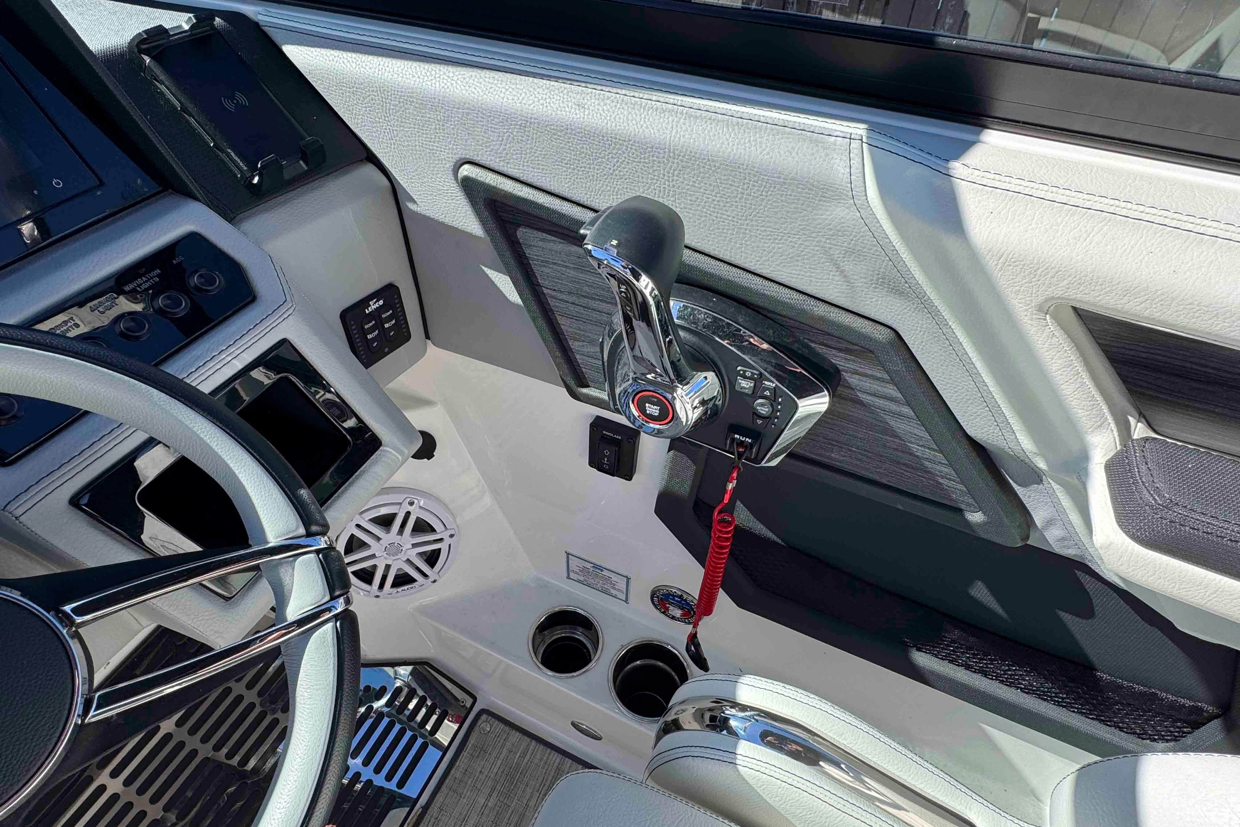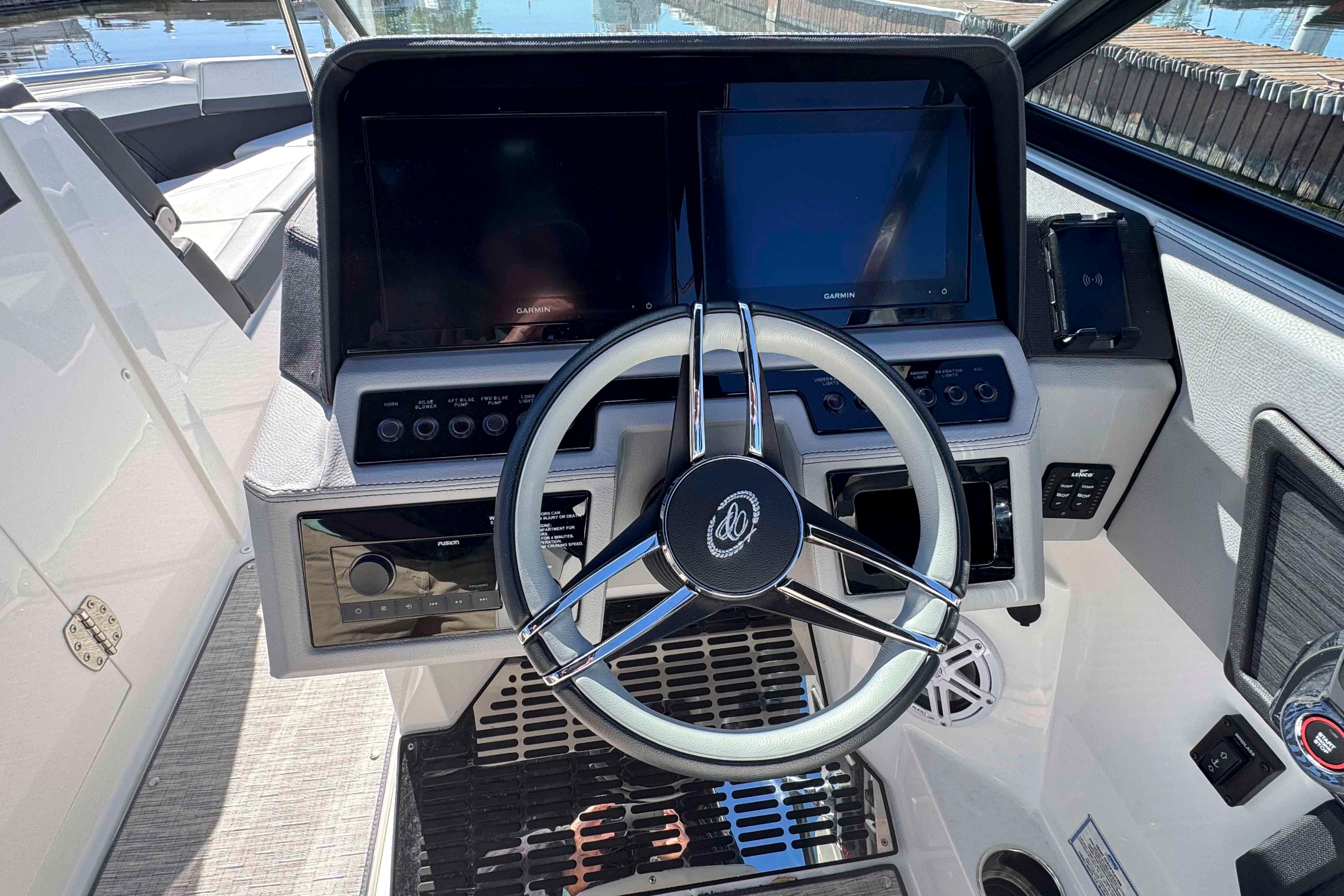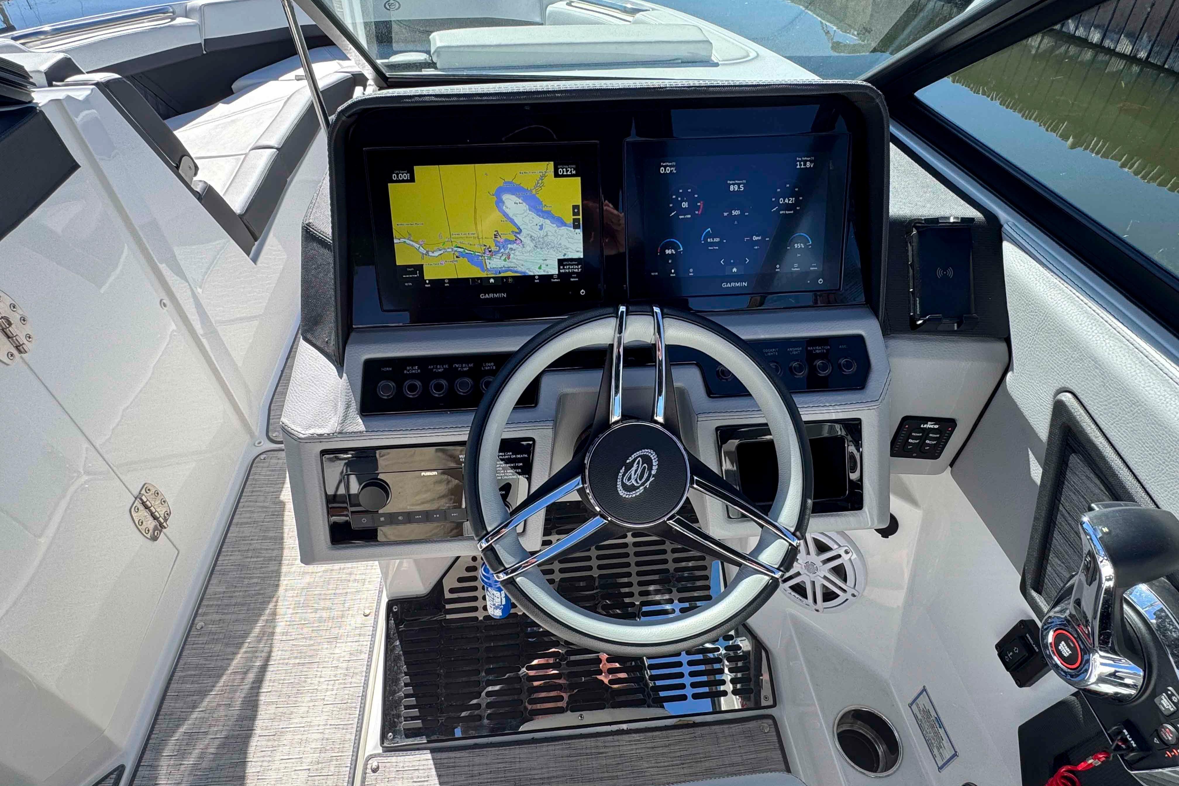 - Fusion sound system (iPod/USB/MP3 Port, Bluetooth) w/ upgraded RGB JL Tower Speakers (total of 10 speakers) w/sub-woofer and 2 amps, remotes located in Dash and Stern Areas