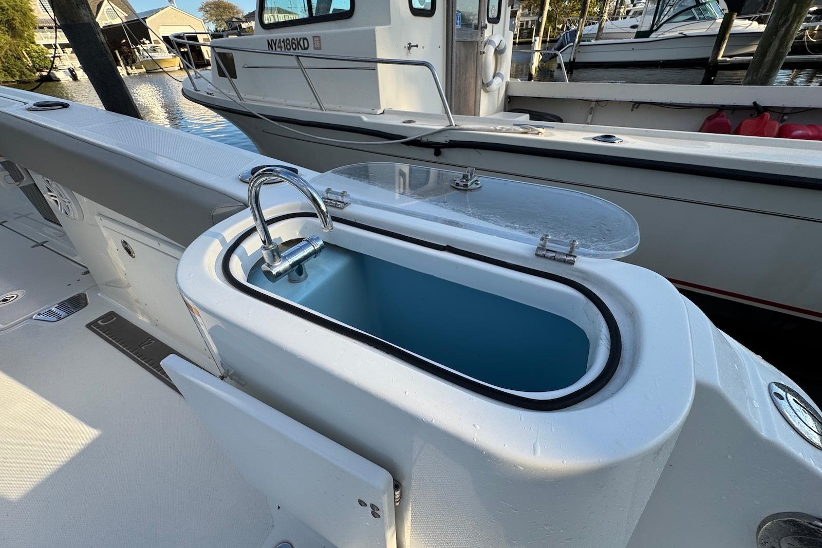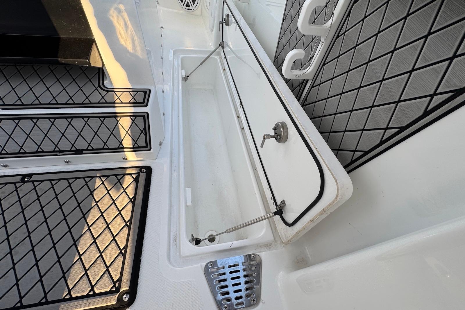 - Storage/fishbox(es), floor w/ macerator and overboard drain